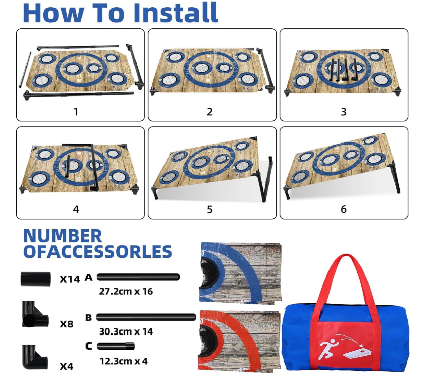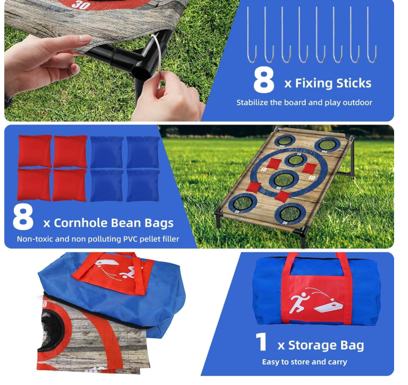 ZelleNew in box Portable Cornhole Board SetEasy To Store And Carry: This funny corn hole board set includes 2 removable boards(3*2FT), 8 bean bags, a storage bag, an instruction booklet, and 8 metal stakes for stability. Perfect for portability and compact storage
