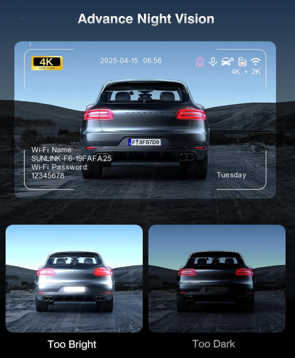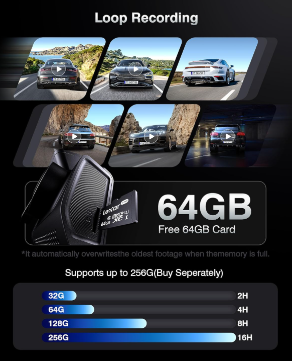 ZelleBlazing Wi-Fi & Built-in GPS5.8GHz Wi-Fi enables real-time viewing, downloading, and sharing of 4K footage directly via the Cam app. GPS tracking embeds speed/coordinates/timestamps onto videos. Forward critical clips to insurance in minutes, all without removing the SD card, enabling instant evidence access. 24/7 Full-Color Parking ModeThis Car Security Dash Cam offers uninterrupted protection with 24-hour parking monitoring, instantly activating via G-sensor upon impact or motion when parked. Time-lapse mode compresses hours into minutes for efficient surveillance, while seamless loop-recording overwrites old footage on the pre-installed 64GB SD card (expandable up to 512GB) to ensure continuous capture ( Hardwire kit is needed ). Effortless Setup and OperationInstall and operate this dash cam system in minutes with our 3-step tool-free setup: Snap the camera onto the windshield . Conceal cables along the trim with included guides. Plug into the 5V socket of car charger. No professional help needed! The generous 3.39 inch HD IPS screen offering crisp live previews, effortless menu navigation, and instant playback of critical footage.
