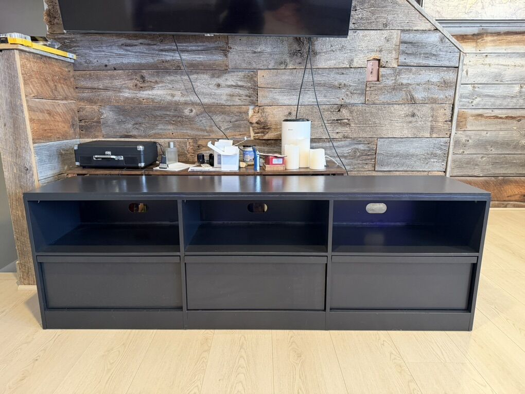 Selling a modern black TV stand / media console with 3 open shelves and 3 storage drawers. Originally brand new, but I repaired and refinished it after minor shipping damage. It is now solid, clean, and looks great.