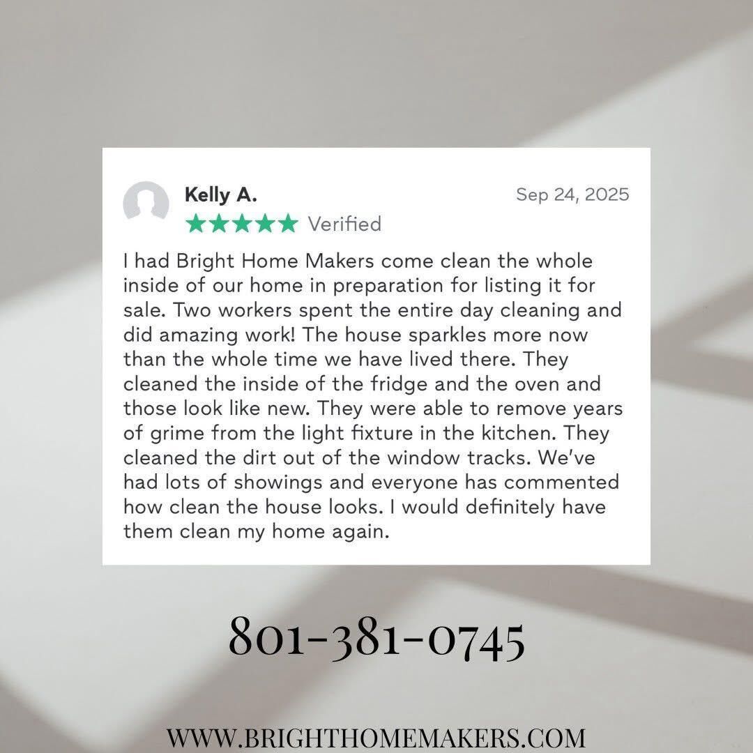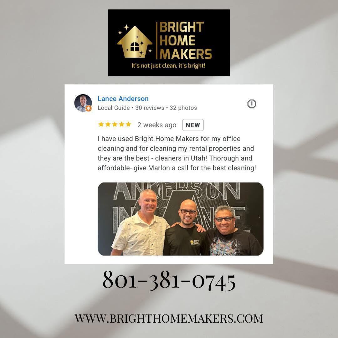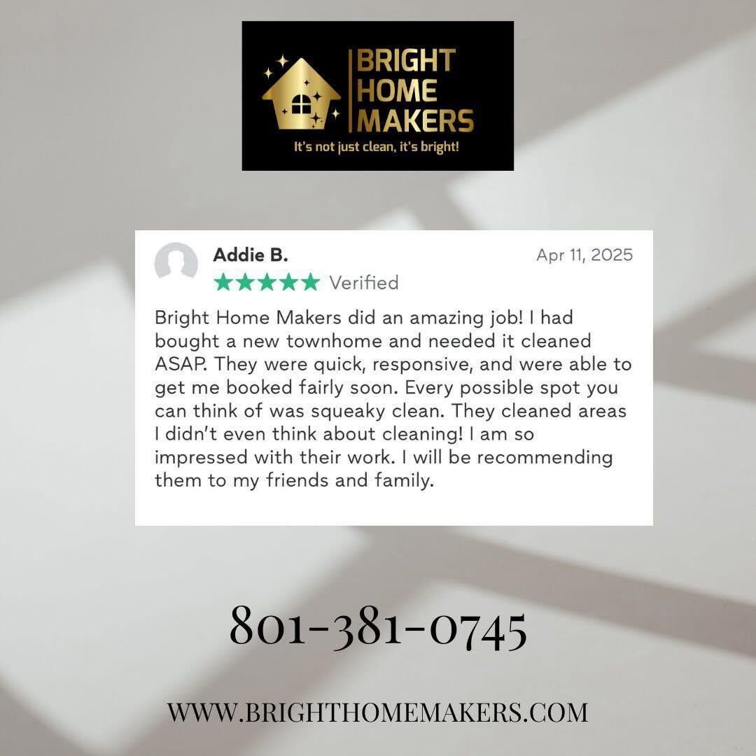 We know life gets busy — that’s why we’re here to help. Bright Home Makers is a family-owned cleaning company that treats every home like our own. From regular and deep cleanings to move-outs, Airbnb, office, and post-construction jobs, our friendly team brings care, detail, and heart to every service. Because a clean home just feels better. ?.
