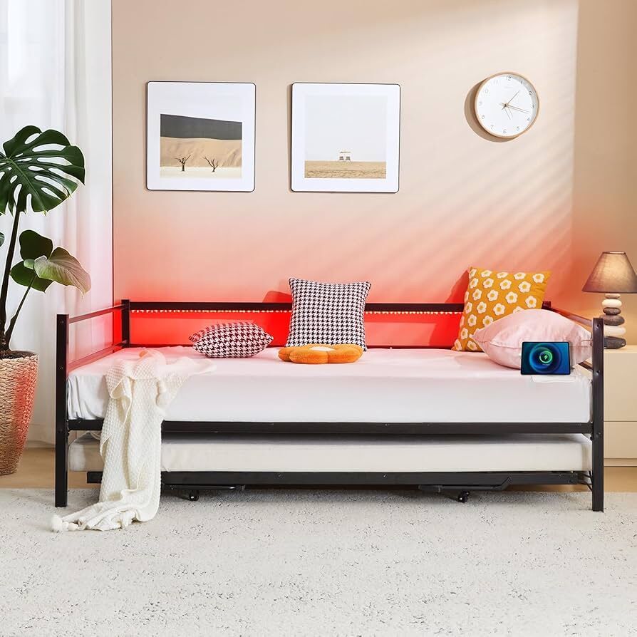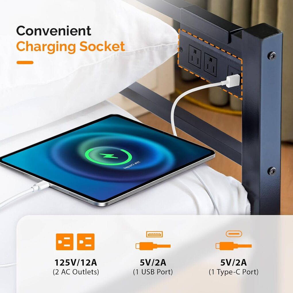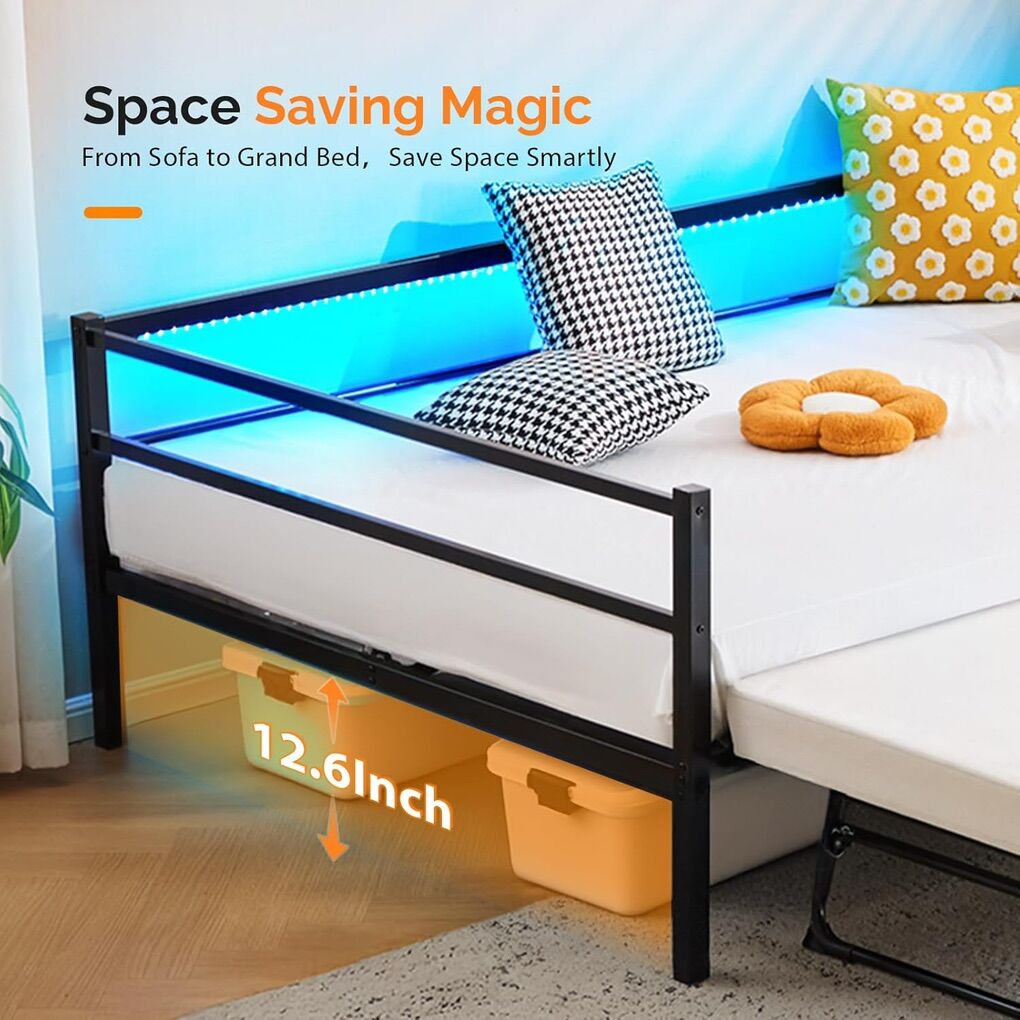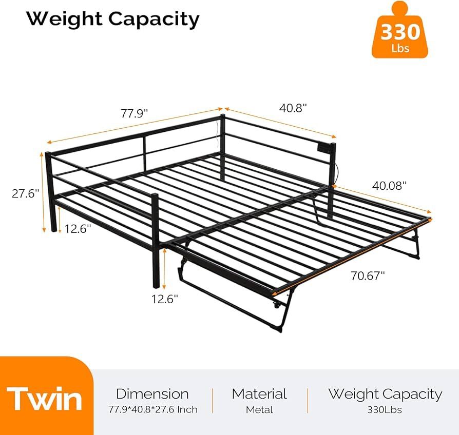 With 3 convenient ways to charge - 2AC Outlets,1USB,1Type-C, you can effortlessly power up your devices. No more scrambling for outlets. Especially great for small living spaces. No Box Spring NeededThe platform style of this Trundle Bed design allows you to place this daybed directly on the floor or over carpet for easy setup and mobility between rooms as desired. 3 in 1 Space SavingEffortlessly lift the pop - up trundle bed of this daybed. Transformed into a king - size convertible bed, Underneath storage space is perfect for stowing away extra bedding, toys, books.Ensuring your living area remains neat and clutter - free. Durable Metal FrameConstructed with