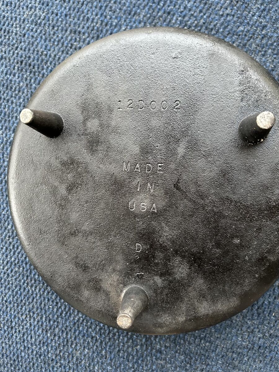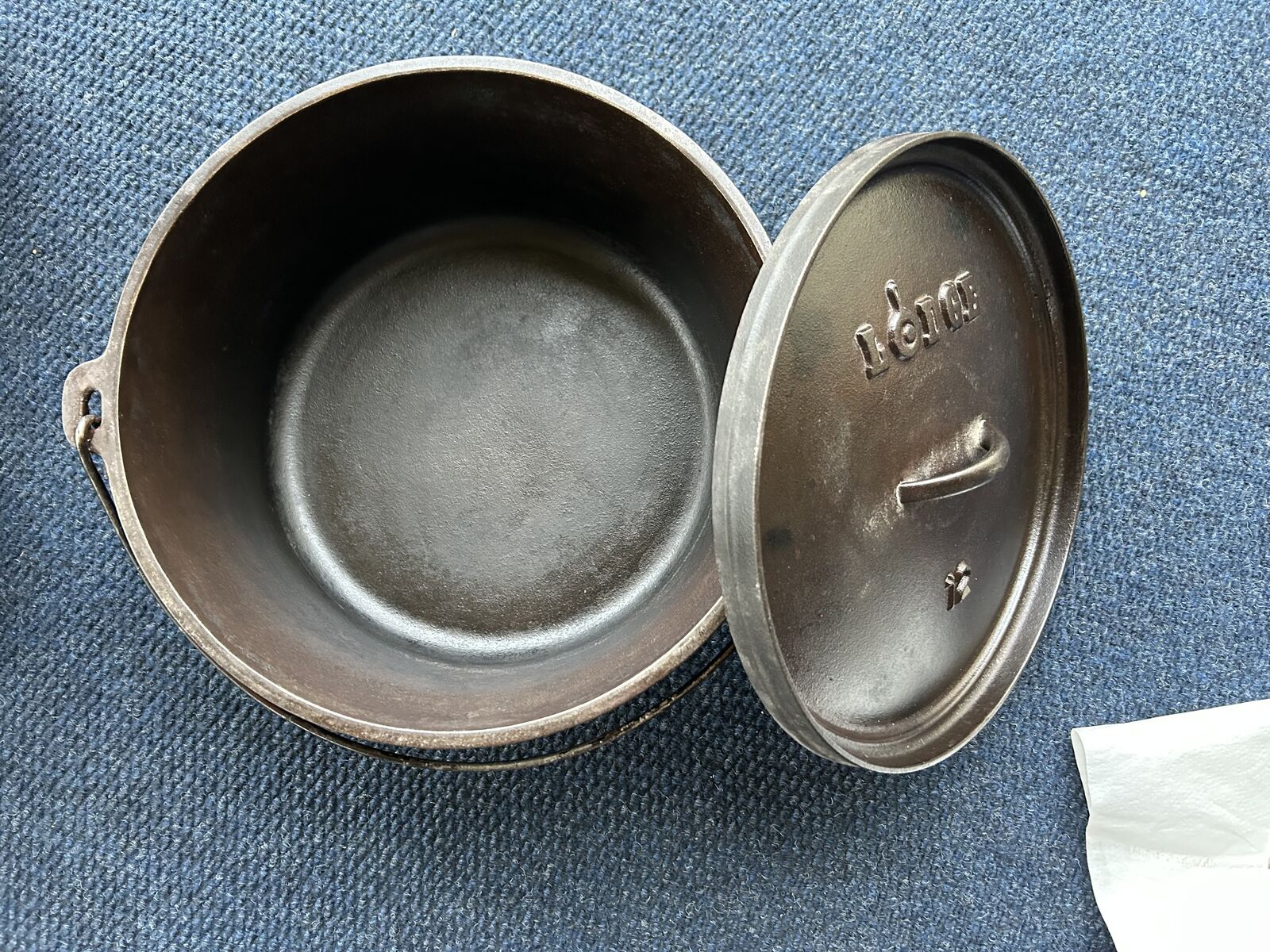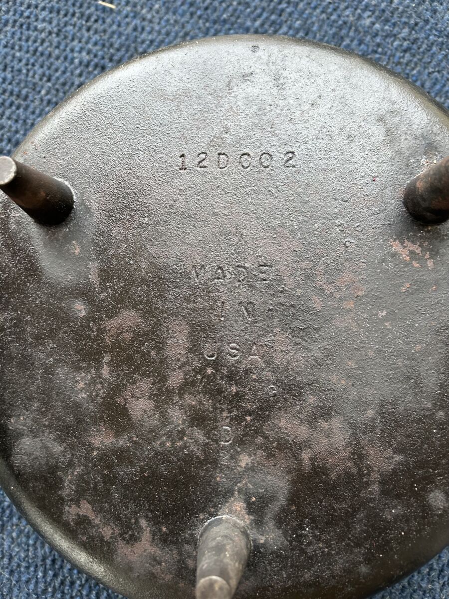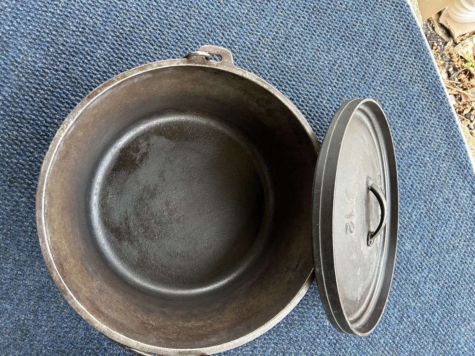 Venmo12" 8 quart cast iron Lodge Dutch ovens with legs and handle. Flanged lid for easy holding of briquettes. No rust, well seasoned model #12D 002. $60 for one or purchase both for $100.