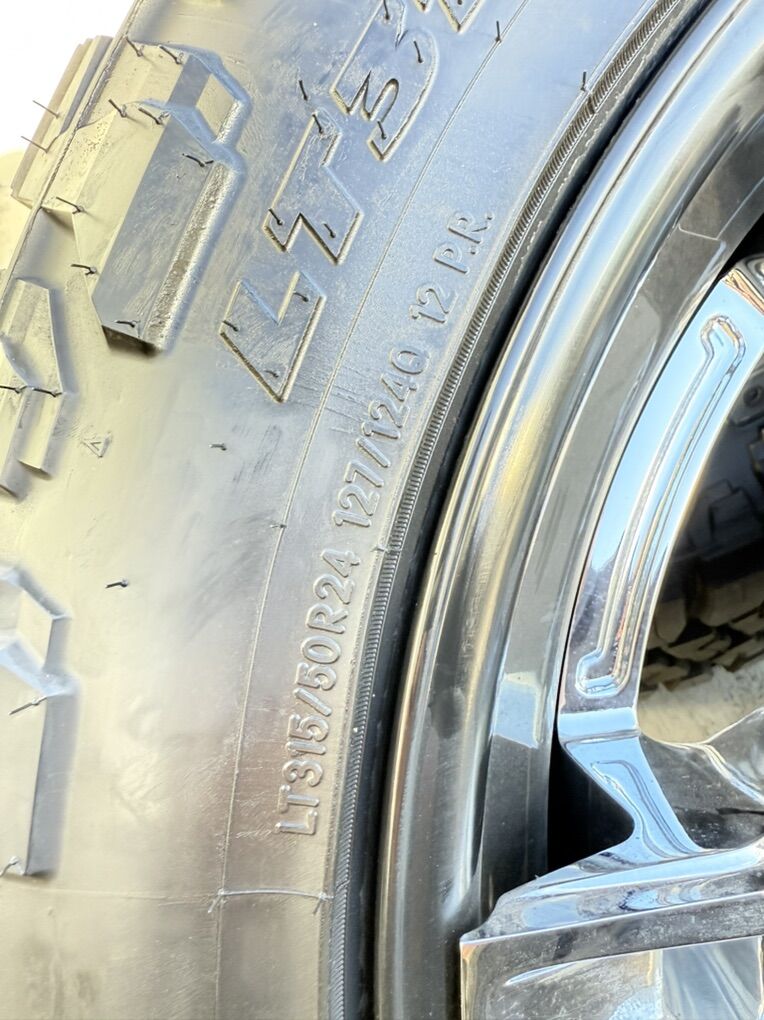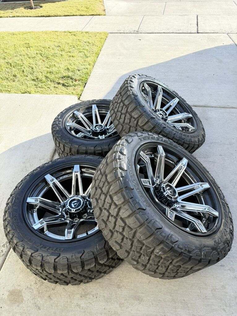 24x12 -44mm 8on170 Fuel Forged Wheels, Toyo Open Country R/T Pro tires in a 315/50/24 Measure 37 Tall and 13 wide. Comes with Sensors They balanced and ready to bolt on This set is around $7k new at the store Save hundreds Text anytime 385-402-2292