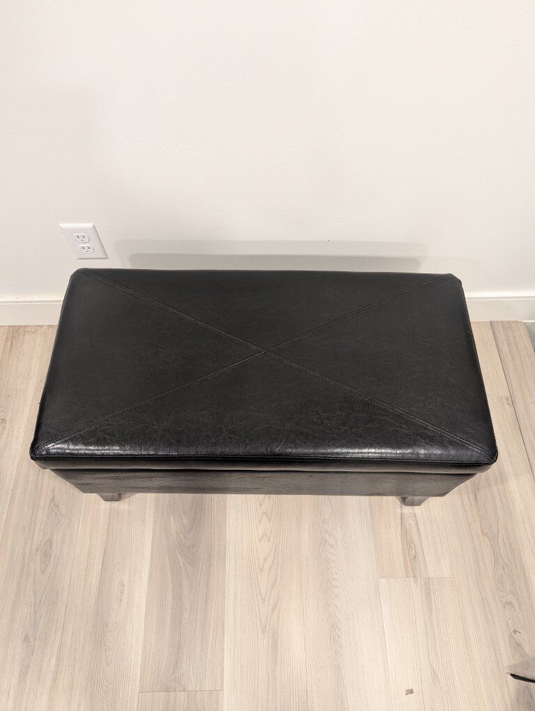 VenmoBlack/Dark Brown storage ottoman. Fake black leather. In good condition. Minor wear.