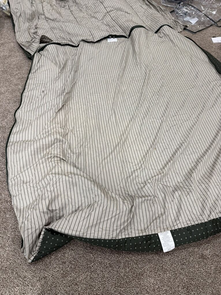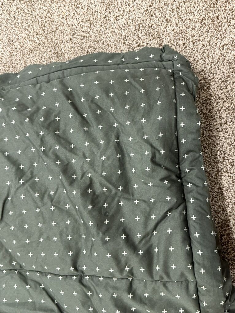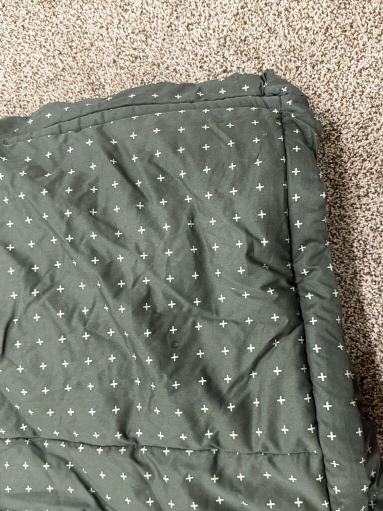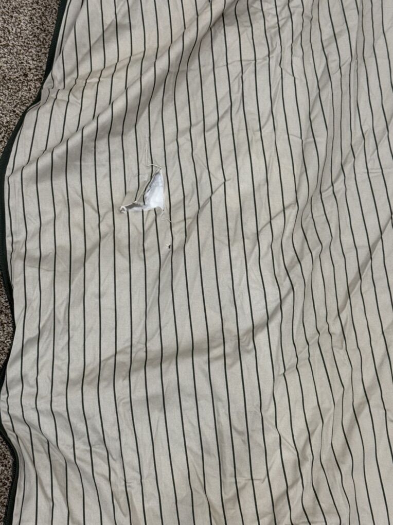 Has 2 shams and 2 cases, some stains throughout (might wash out not sure) and 2 holes in sheet and tiny holes toward bottom (looks like a pencil poke). JAN11