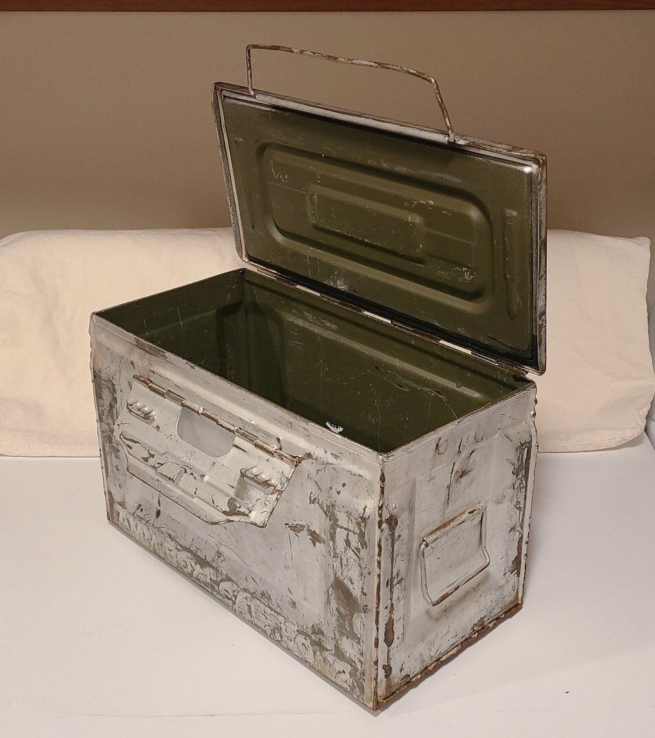 Vintage ammunition box. Metal - it was originally army green but it was painted silver.