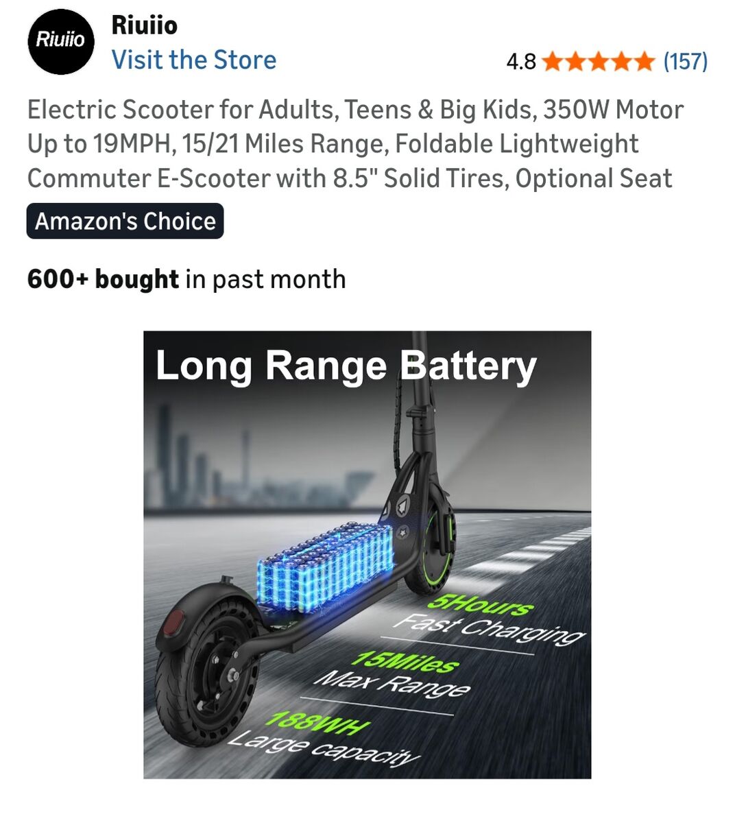 VenmoBrand - Riuiio Color - Black Age Range (Description) - Age 16+ Special Feature - 19Mph scooter, Cruise Control, Foldable, Lightweight Weight Limit - 264 Pounds Product Dimensions - 39"L x 5.5"W x 42"H