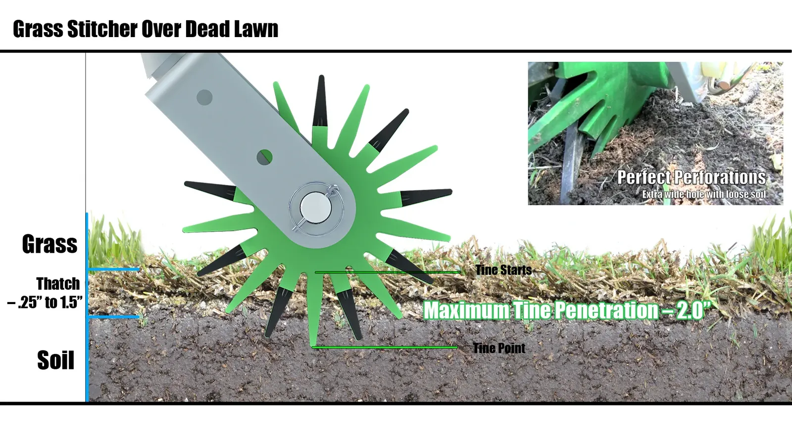 The Stitcher punches right through existing thatch or mulch and provide the perfectly shaped hole to receive and nurture your seeds.