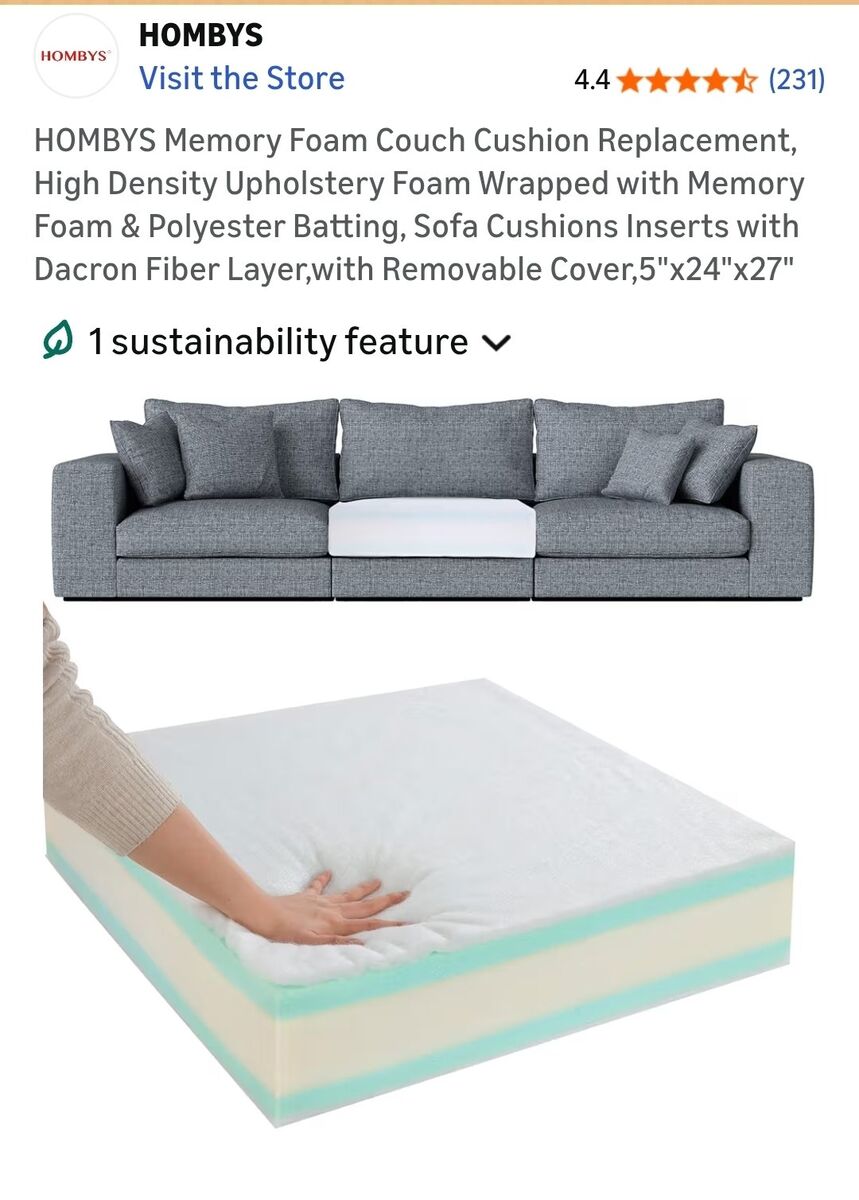 24x27 and 5" thick memory foam cushion. About $55 new, I let it expand and haven't used it (didn't fit for what I needed).