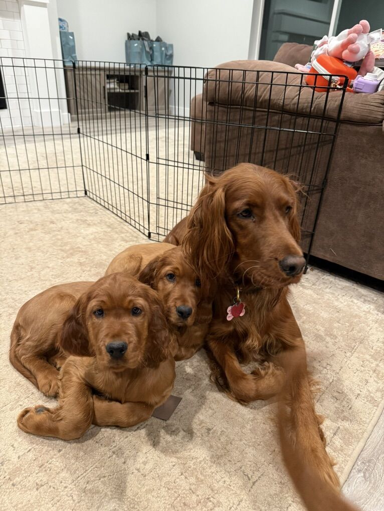 **Irish Setters need daily exercise, mental stimulation, and lots of human interaction. They do not do well as “outside only” dogs, or being alone most the day. We raise healthy, well-socialized puppies and are excited to place them in loving, prepared homes. We own the mama, Queenie (first 2 pictures), who is the most loving doggy ever. She is very submissive and patient. She is about 53 lbs. Pippin is the stud dad and he is so handsome and the biggest snuggle baby! He just wants to be held, loved, and played with. He’s about 66 lbs. This is their SECOND litter together.