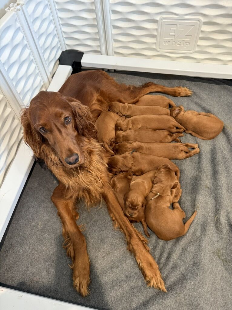 PayPalNow taking deposits for our Irish Setter puppies! *puppy pictures provided are from our previous litter. We are so excited to share that we have an upcoming Irish Setter litter planned, with puppies expected to be born around March 10. If all goes as planned, puppies will be ready to go to their forever homes starting May 5 at 8 weeks old!