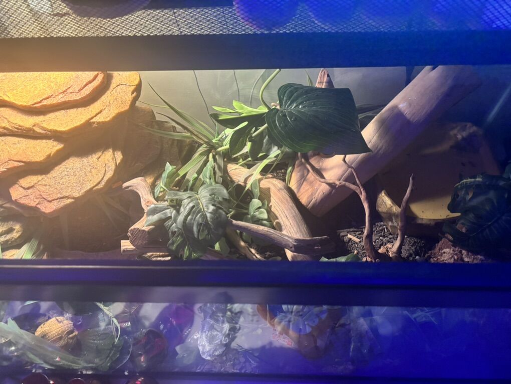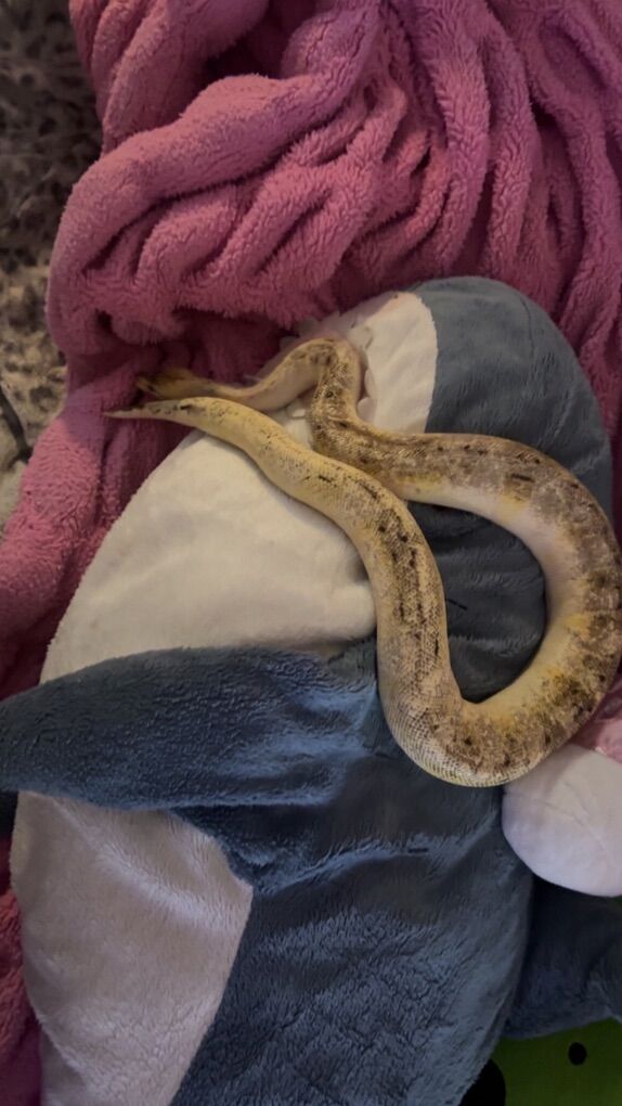 this is a female ball python hatched 8/6/23 she’s 2 yrs old and pastel enchi champagne morph this all comes together snake enclosure and clutter together comes with a water bowl as well