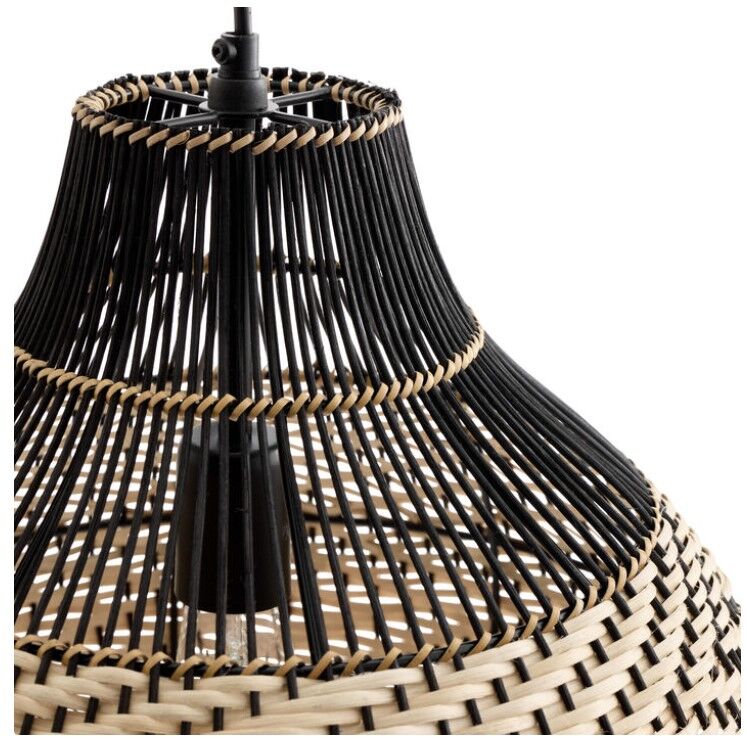 Our bell-shaped pendant lamp is handwoven by Indonesian artisans of black and natural rattan with a cohesive contrast of geometric patterns. Its two-tone rows of chevrons and checkered stripes are capped with vertical open-weave rattan strands in all black. The result is an artisan hanging lamp filled with woven texture and flowing movement. Its symmetrical silhouette and neutral colors are perfect for putting up in pairs and multiples.
