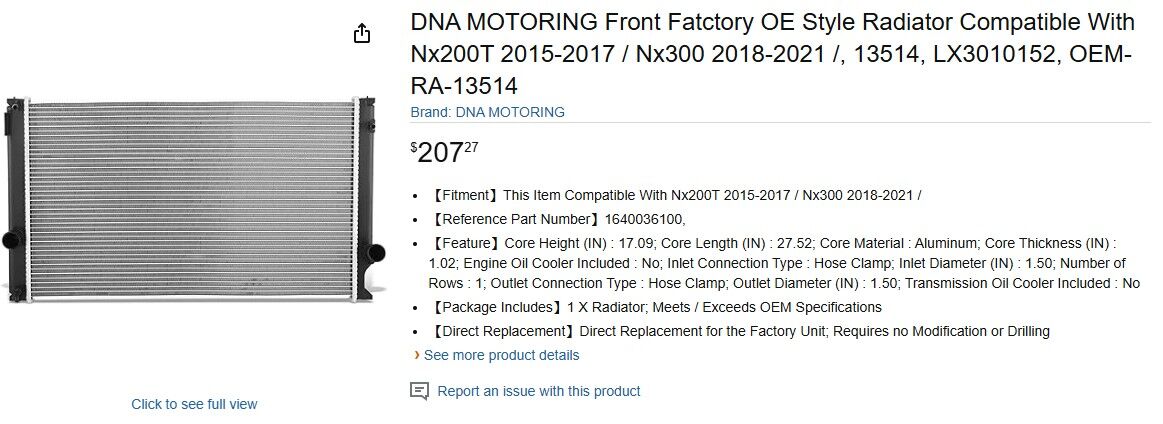 ApplePayDNA MOTORING Front Fatctory OE Style Radiator Compatible With Nx200T 2015-2017 / Nx300 2018-2021 /, 13514, LX3010152, OEM-RA-13514