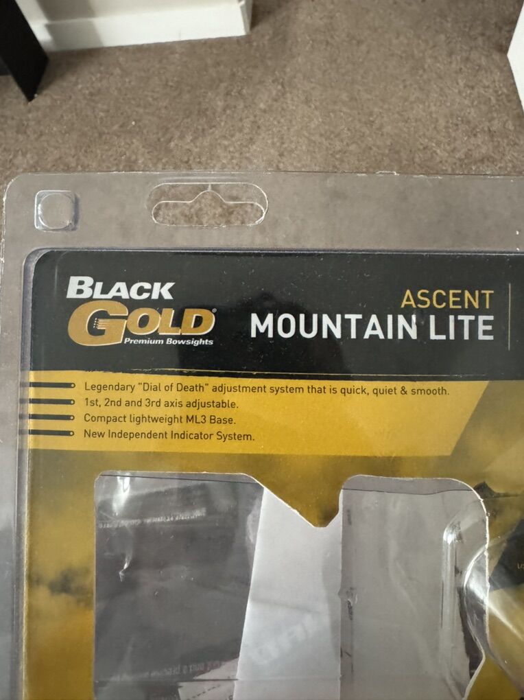 VenmoBrand new, custom pins, Black Gold Ascent Mountain Lite. The sight hasn’t been anywhere except for the backyard for a bit of practice. There isn’t a ding or blemish on it.