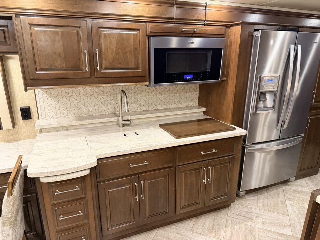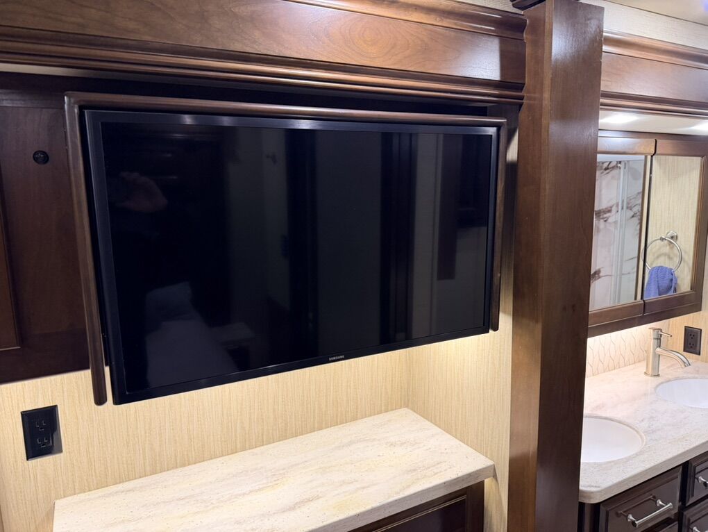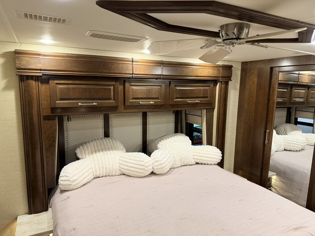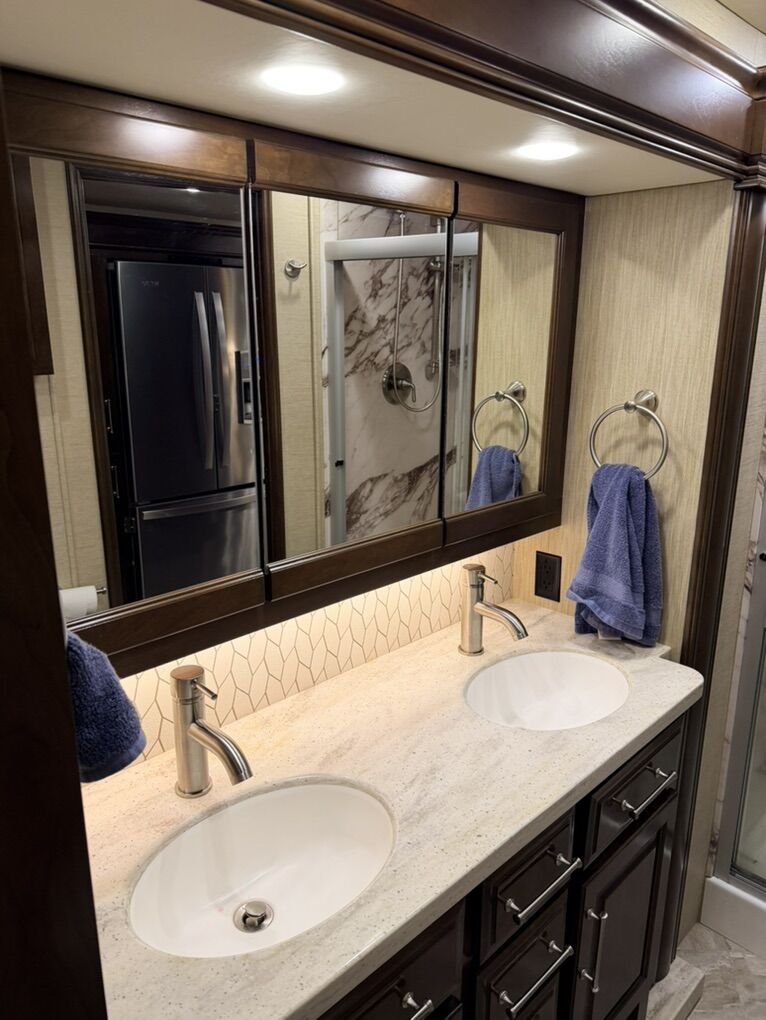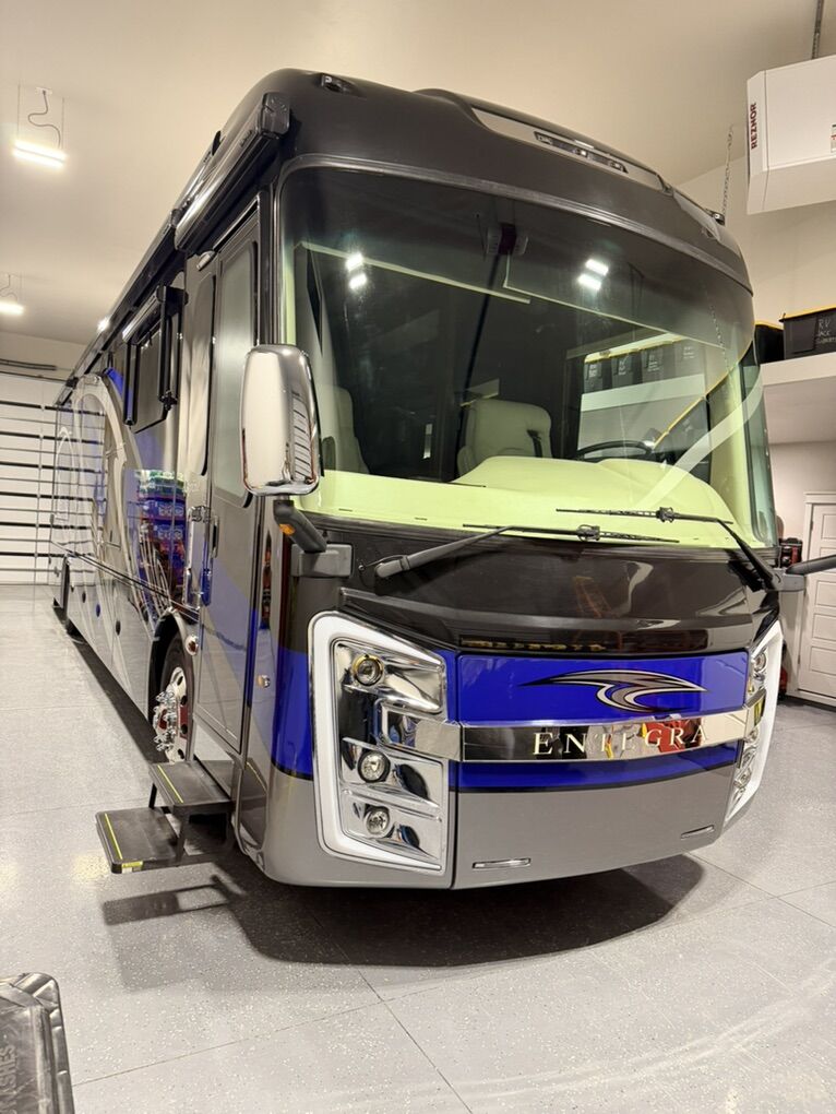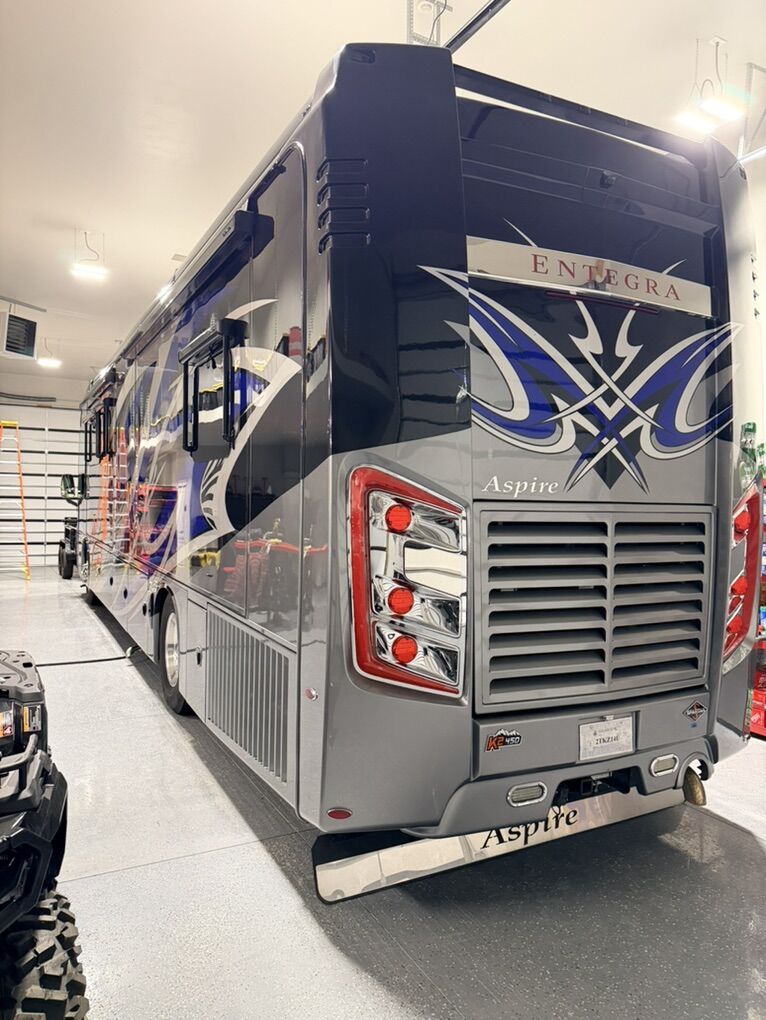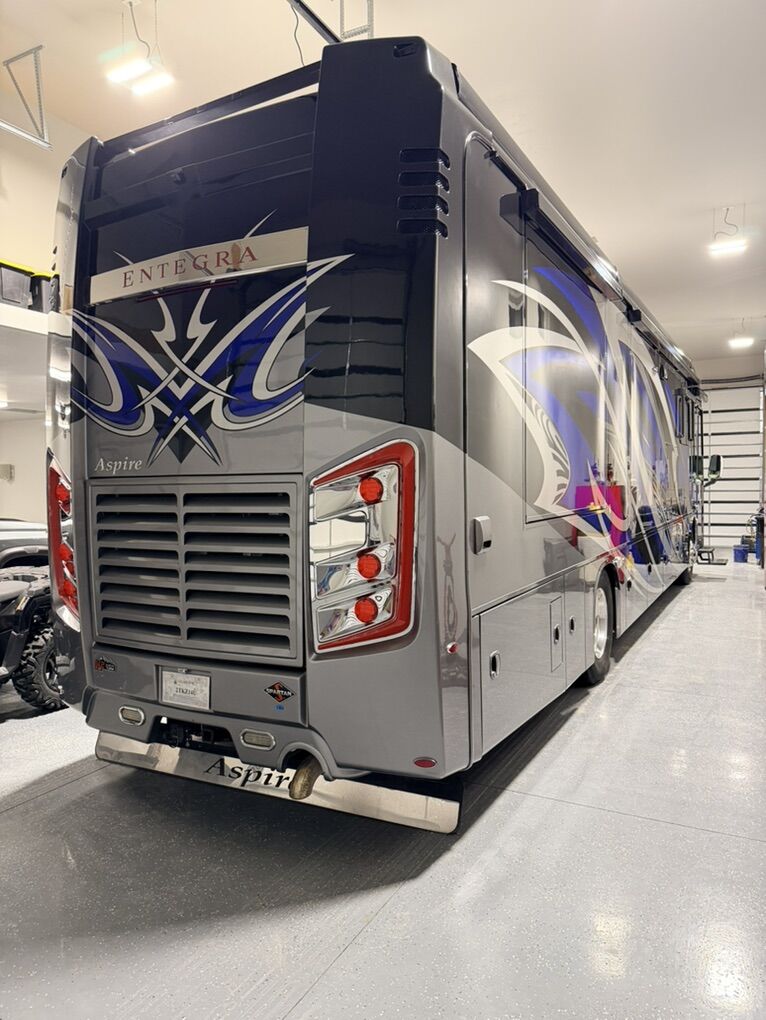 Are you ready for luxury at a manageable length? This 2019 Entegra Aspire 38M (total length 40’) may just be the ticket! 39,450 miles with a 450HP Cummins and Allison transmission on the Spartan Chassis gives you a comfortable ride with all the power. Freshly serviced with new coach and chassis batteries, new windshield and 4 slide-outs with electric awnings, electric door awning, manual window awnings and full unit electric side awnings, outdoor entertainment, 3 air conditioning units, pass-thru storage with sliding tray and hydraulic leveling that makes set-up a breeze. 10K Onan generator, Aquahot 400D, electric power cord reel, electric hose reel, fuel tank accessible from both sides. Rear tow hitch with trailer brakes. Full body paint, cameras, electric steps and alarm system finish off the exterior of the unit nicely. This is stored in our heated RV garage. Interior features alabaster finishings, navigation, camera screen for exterior cameras, 6-way driver and passenger seats, electric stair cover, auto cockpit shades, fireplace, sofa sleeper, recliner, 2 televisions, dirt devil central vacuum system and pull-out dining with 2 chairs. Kitchen with luxury residential 4 door refrigerator with icemaker, flat top 2 burner stove, convection microwave and pull-out pantry. Bath stuns with dual entry, double sinks, glass shower enclosure with skylight, ample storage and macerator toilet. Bedroom features a king bed with built in nightstands, reading lights, large closet, stackable washer and dryer, large number of cupboards and drawers, ceiling fan, television and hidden safe. Serious Inquiries Only, No Codes, etc