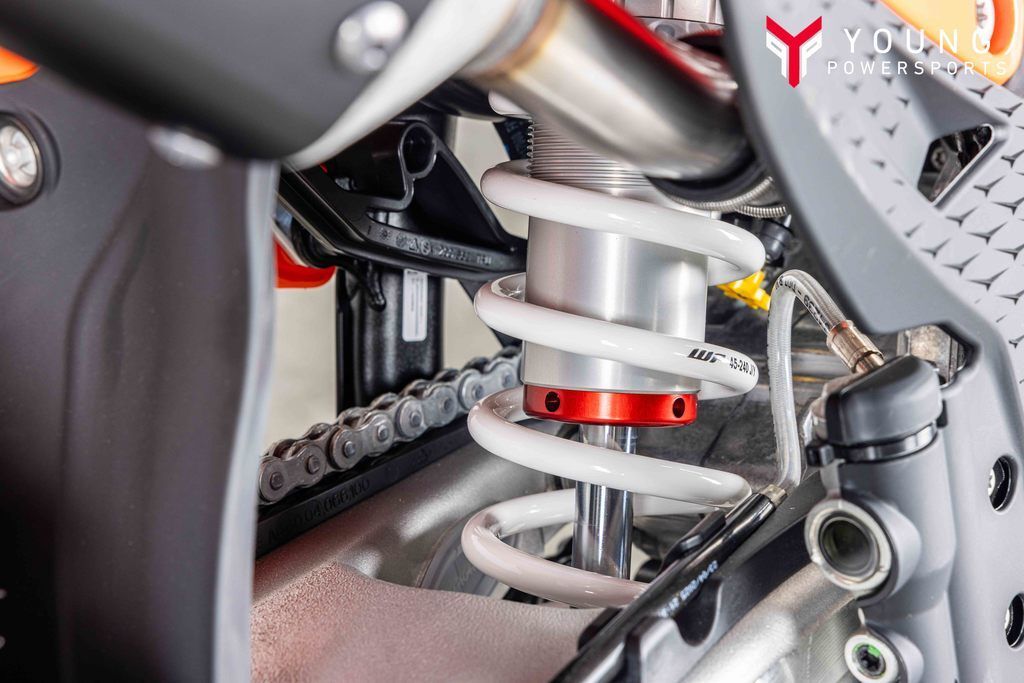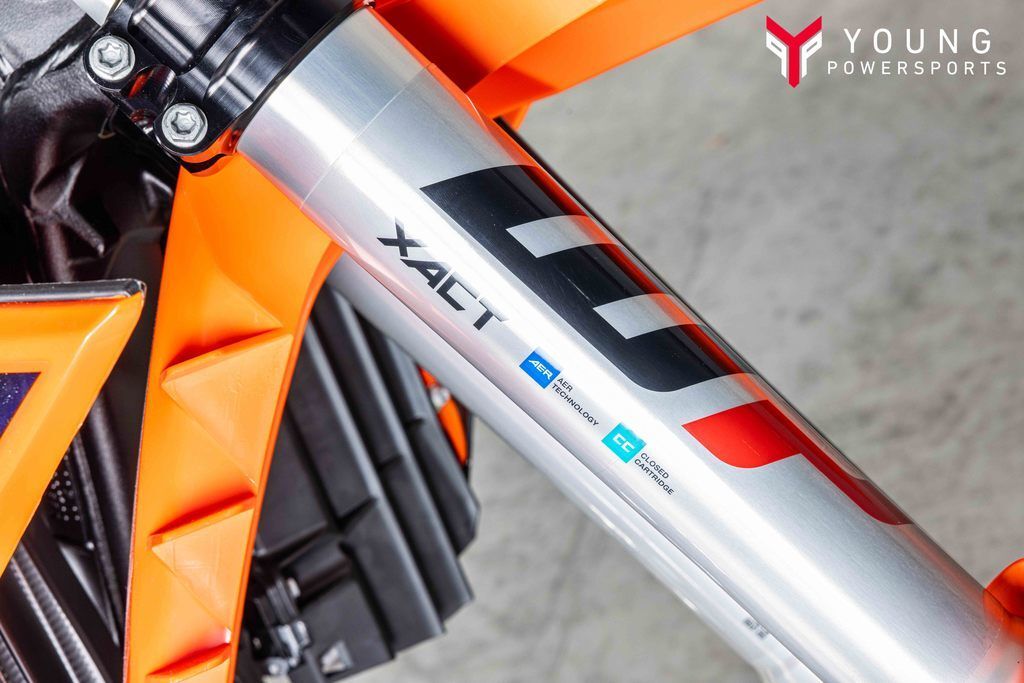 Let's get the technical parts out of the way first; the 48 mm WP XACT AER forks fitted to the KTM SX and SX-F line-up features a capsulated air spring and pressurized oil chamber for progressive and consistent damping, while oil and air bypasses reduce pressure peaks. In combination with the mid-valve damping system, all this provides exceptional feedback and rider comfort. The fork also has settings which not only compliment the frame and rear linkage, but ensures stellar performance at all levels. Speaking of settings, these are easily adjusted via a single air pressure pre-load valve, as well as easy-access click adjusters for compression and rebound. Additionally, the WP air pump needed to adjust the fork's air pressure is provided as standard in the buy-pack.