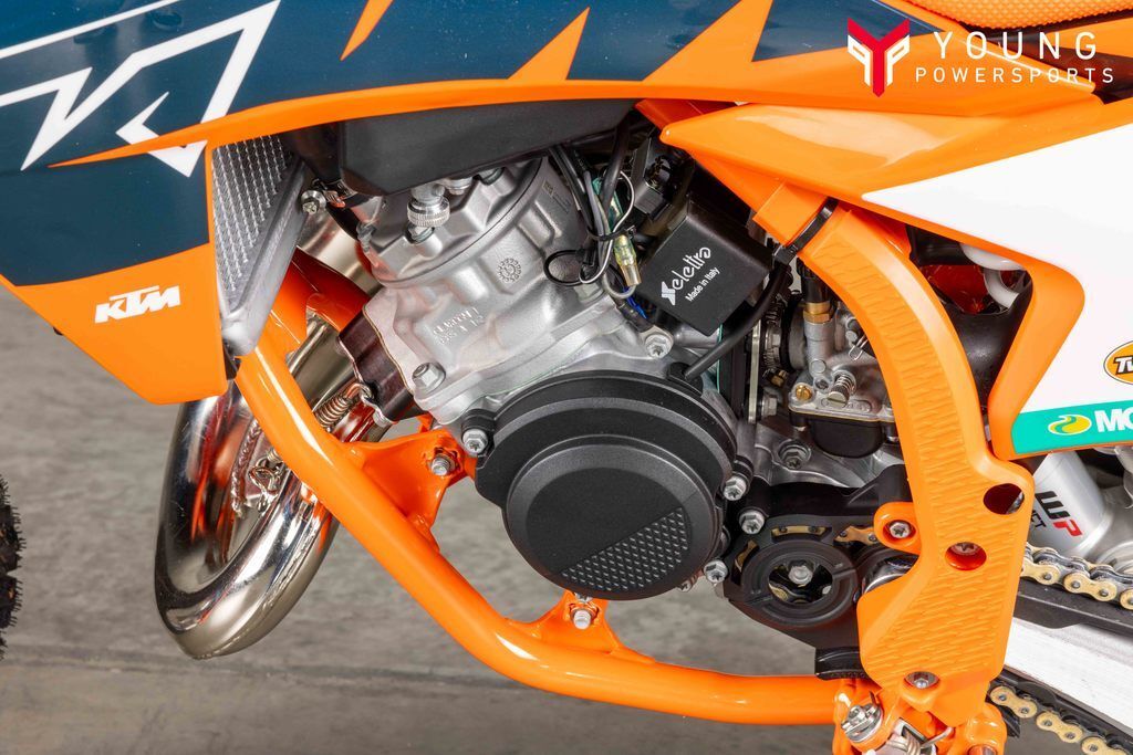 The KTM 50 SX FACTORY EDITION features a modern and compact engine using the latest 2-stroke technology. Using a 3-shaft design, the crankshaft is positioned near the center of gravity, which benefits mass centralization and creates the ideal intake angle into the reed valve for top-level performance. For 2026, the transmission shafts are new developments with wider dimensions and several components have been reinforced to enhance durability.