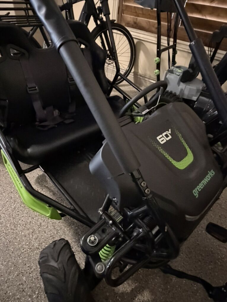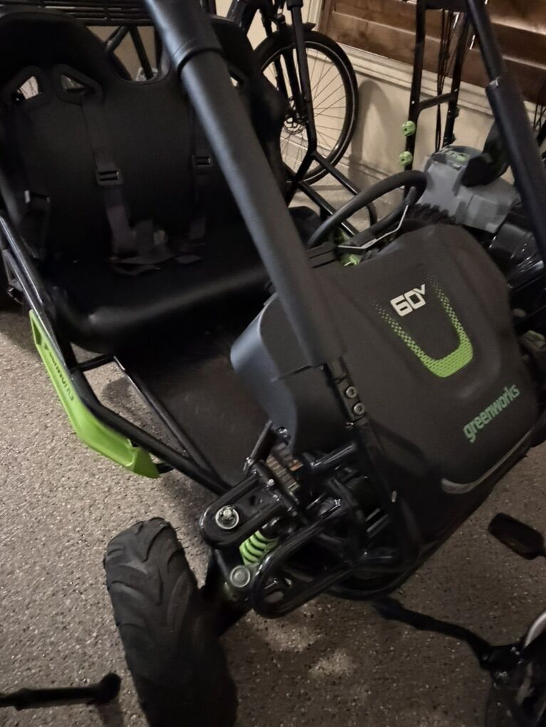 Greenworks 60V electric go-kart in excellent condition. Two-seater with seat belts, sturdy frame, and all-terrain tires. Battery-powered (quiet and no gas), great for kids and teens. Always stored indoors and lightly used for only 2 months , never off road