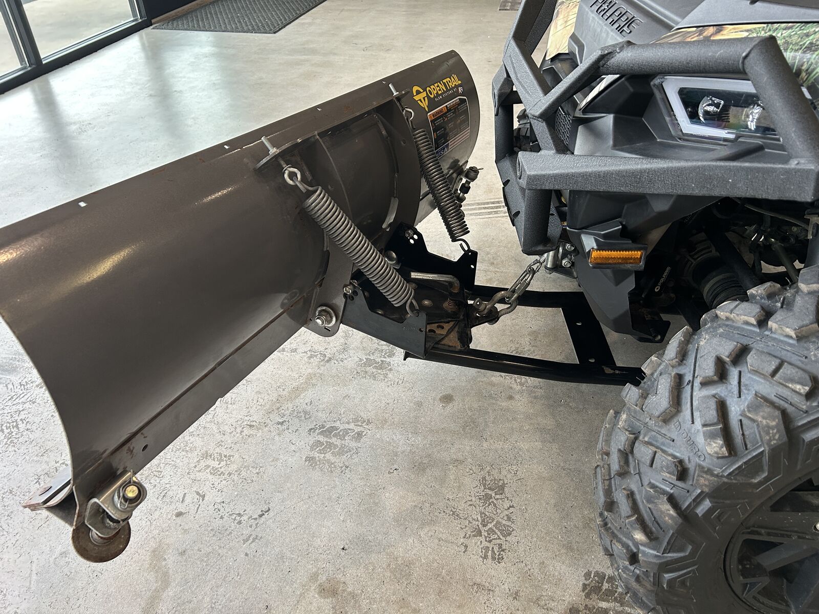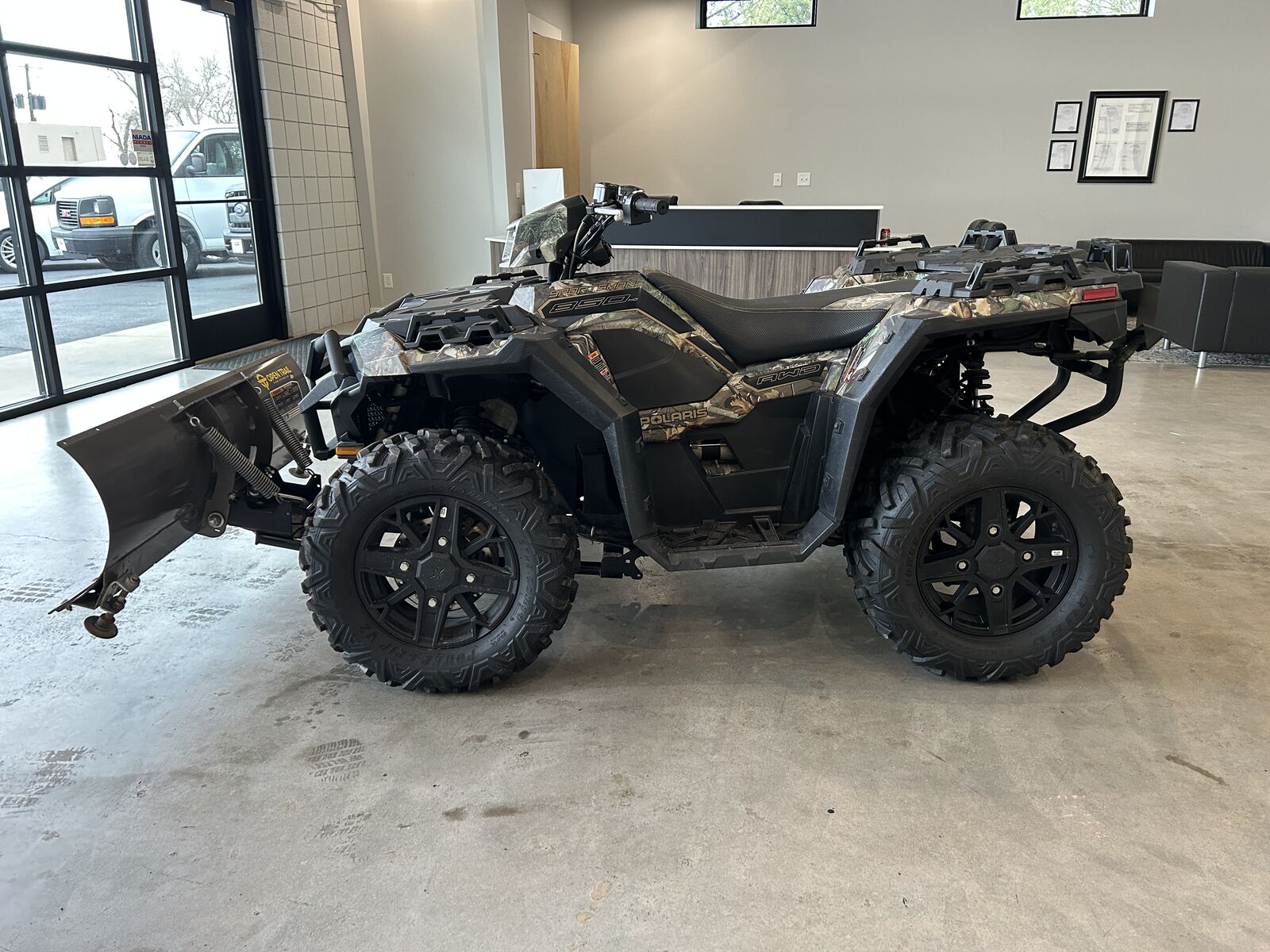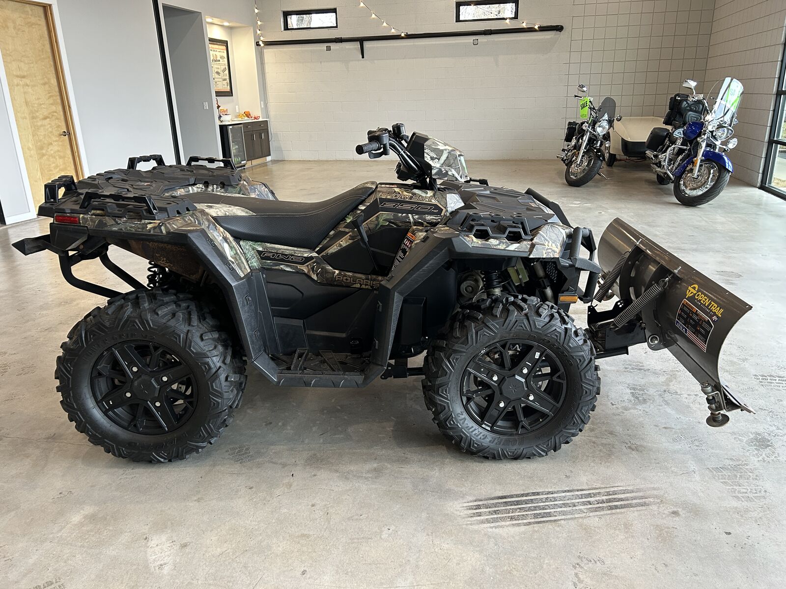 Calling All Outdoorsman! Come see this 2023 Polaris Sportsman 850 Ultimate Trail. Equipped with Polaris’ Pursuit Camo and features a 78 HP ProStar 4-Stroke SOHC Single Cylinder 850cc engine, One Touch On-Demand AWD/2WD, Multi-Select EPS, Electronic Fuel Injection (EFI), One Touch On-Demand AWD/2WD, Automatic PVT with P/R/N/L/H, Engine Braking System (EBS) & Active Descent Control (ADC), and comes equipped with a 3500lb winch, front/rear bumpers, 27" Duro tires on 14" aluminum wheels, and LED lighting. Key specs include 12" ground clearance, 1500 lb towing, 575 lb payload, and 120/240 lb rack capacity, offering enhanced capability over standard models with its trail-focused enhancements. Has an Open Trails plow system by KFI. 835.5 Miles. You’ll be the talk of camp fire with this beauty!
