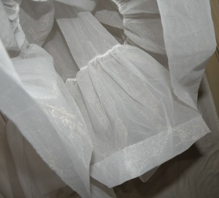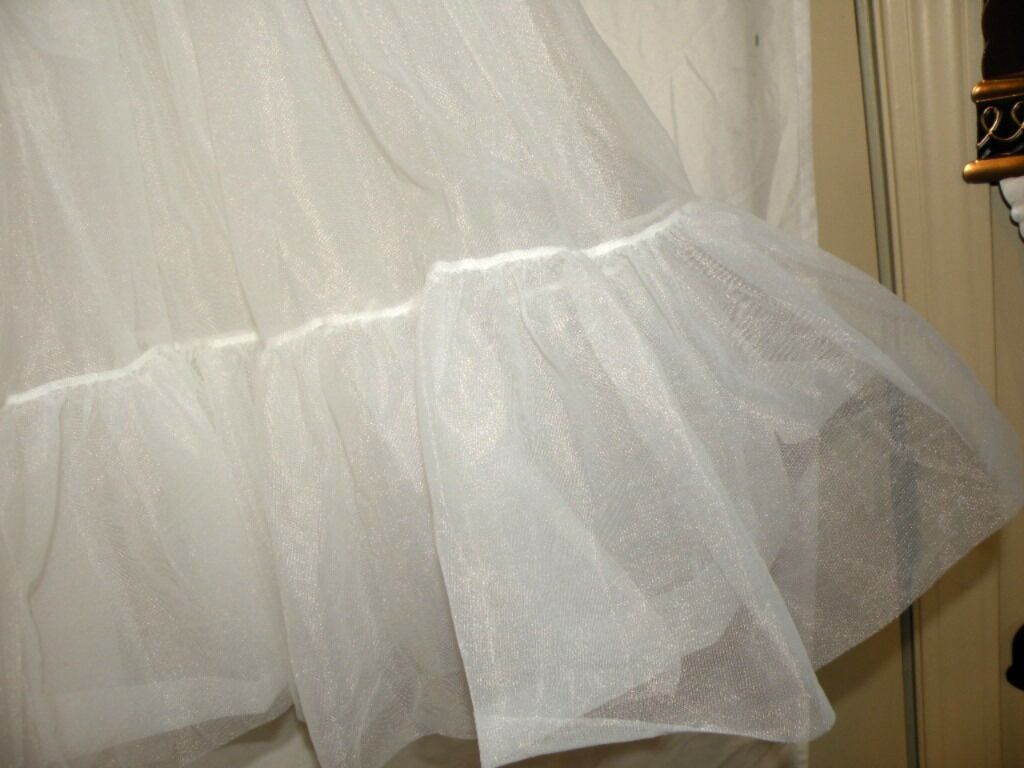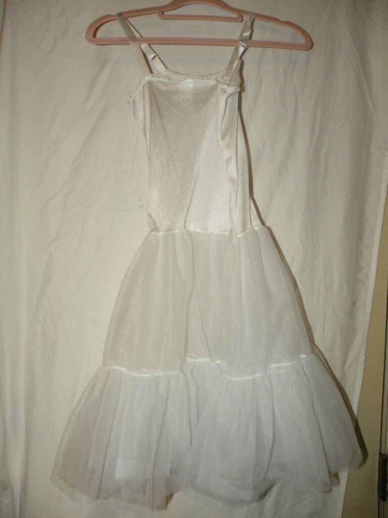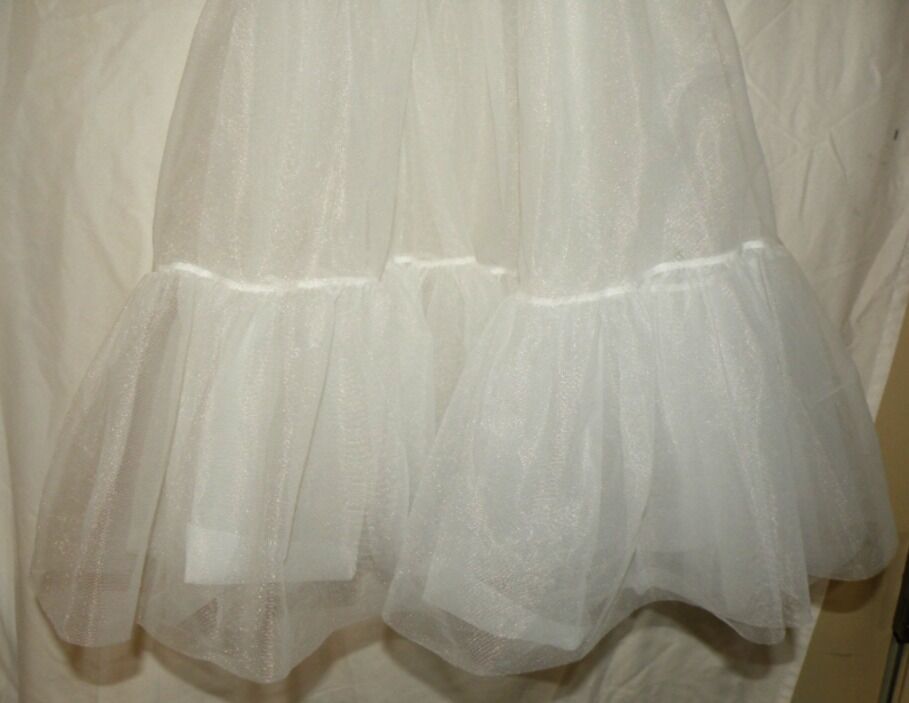 A new mid length crinoline slip with 2 layers. The top is silky nylon and from the lower waist down is mesh nylon that is full. It will make any little girl feel like a princess when she wears it. It has adjustable nylon straps. It shows 6-6x but runs quite large so can easily be worn by a 7-8 size.