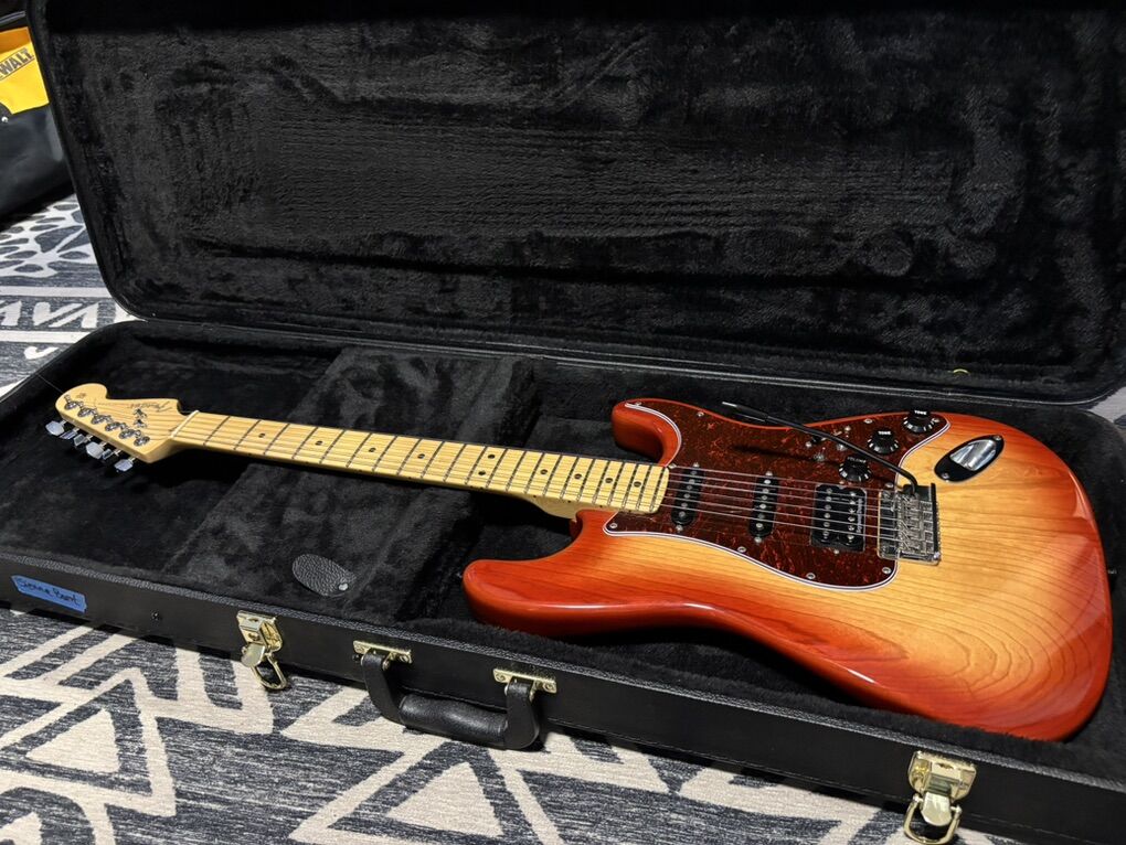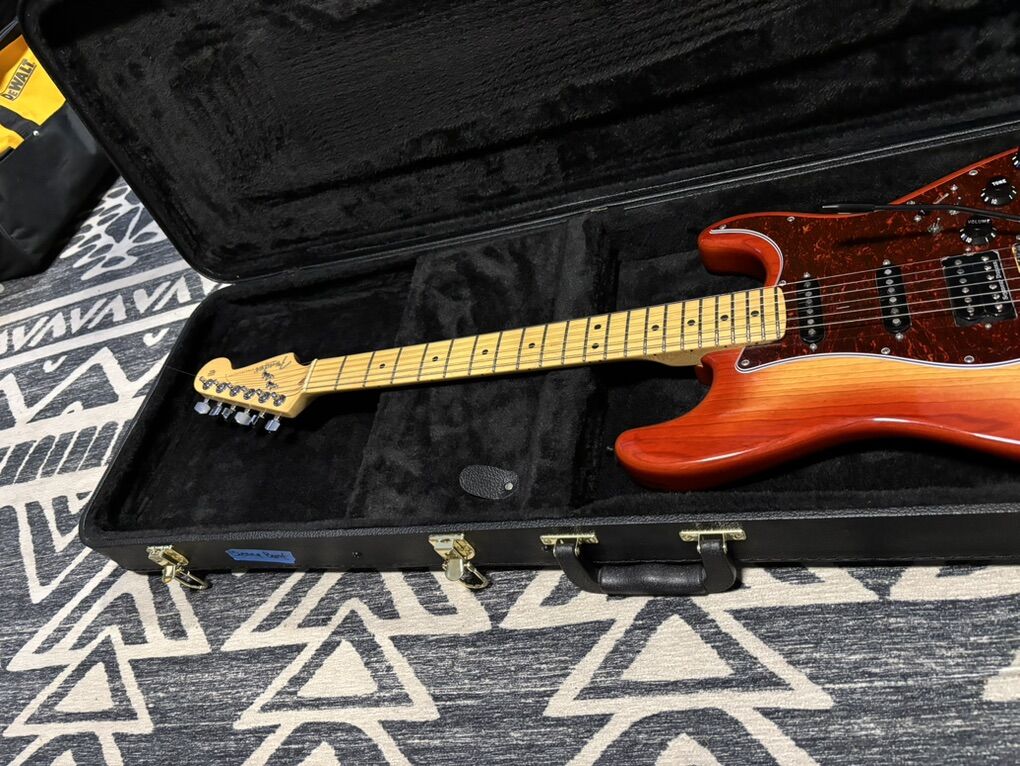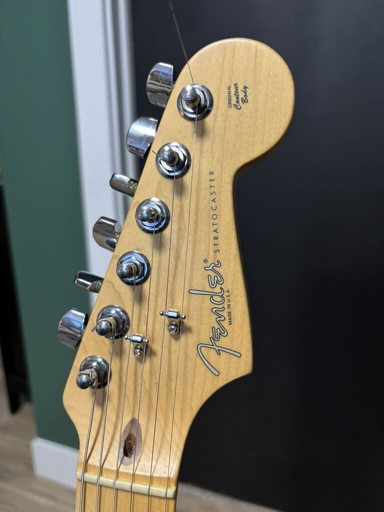 ZelleThis is my hot Strat with all USA Fender parts or better. This started out as a 2003 American Fat Stratocaster, with a Maple Neck, a 2-piece Sienna Sunburst body (gorgeous), and Texas Special pickups. Swapped Pearly Gates humbucker with a hotter JB pickup (don’t have original pickup) for some extra oomph and to better match the hot Texas Specials (the hottest single coil Fender makes). Changed to black color scheme. Callaham bridge upgrade. Carling switches for 1. adding neck pickup and 2. coil-splitting the humbucker. No load tone pot on bridge. 0.1 uF cap to tame the highs. Minor chip in the neck which doesn’t affect playability at all but is a bummer. This guitar is a tone machine that is wickedly versatile: it can go from country to metal and excels everywhere in the spectrum. Can this thing do Jazz too? Yes! Coil-splitting the bridge makes it brighter and clearer while retaining the balls of the JB. The Texas Specials combine nicely with the humbucker, and adding the neck pickup to the bridge (or bridge + middle) provides Tele-like tones and gives you even more options. Adding the neck pickup to the bridge on a strat is also referred to as the Gilmour mod. The middling, meh bridge was changed to a Callaham American Standard upgrade. It has the same string spacing and offset saddle style but with better saddles and a much improved (and heavier) tremolo block. This is a huge tonal upgrade and seriously increases the sustain of this guitar. (The original trem block is a thin little turd of some metal.) The trem springs are vintage spec (a bit slinkier). The body is in excellent shape with no major flaws, but there is a dang chip on the neck, on the 9th fret above the low-E string. It doesn’t affect fretting the string and doesn’t ever touch the string or your fingers. Not sure how it happened but it happened recently. Set up for low action with no buzzing with great playability. Comes with a non-Fender hardshell case. I can swap it for a nice Fender gigbag if you prefer. I have a few super fancy TSA cases as well… Price is firm. No trades (unless it’s a Godfather offer). I can take all forms of payment EXCEPT Venmo, cash preferred.