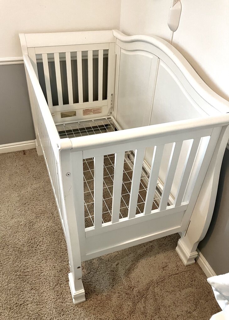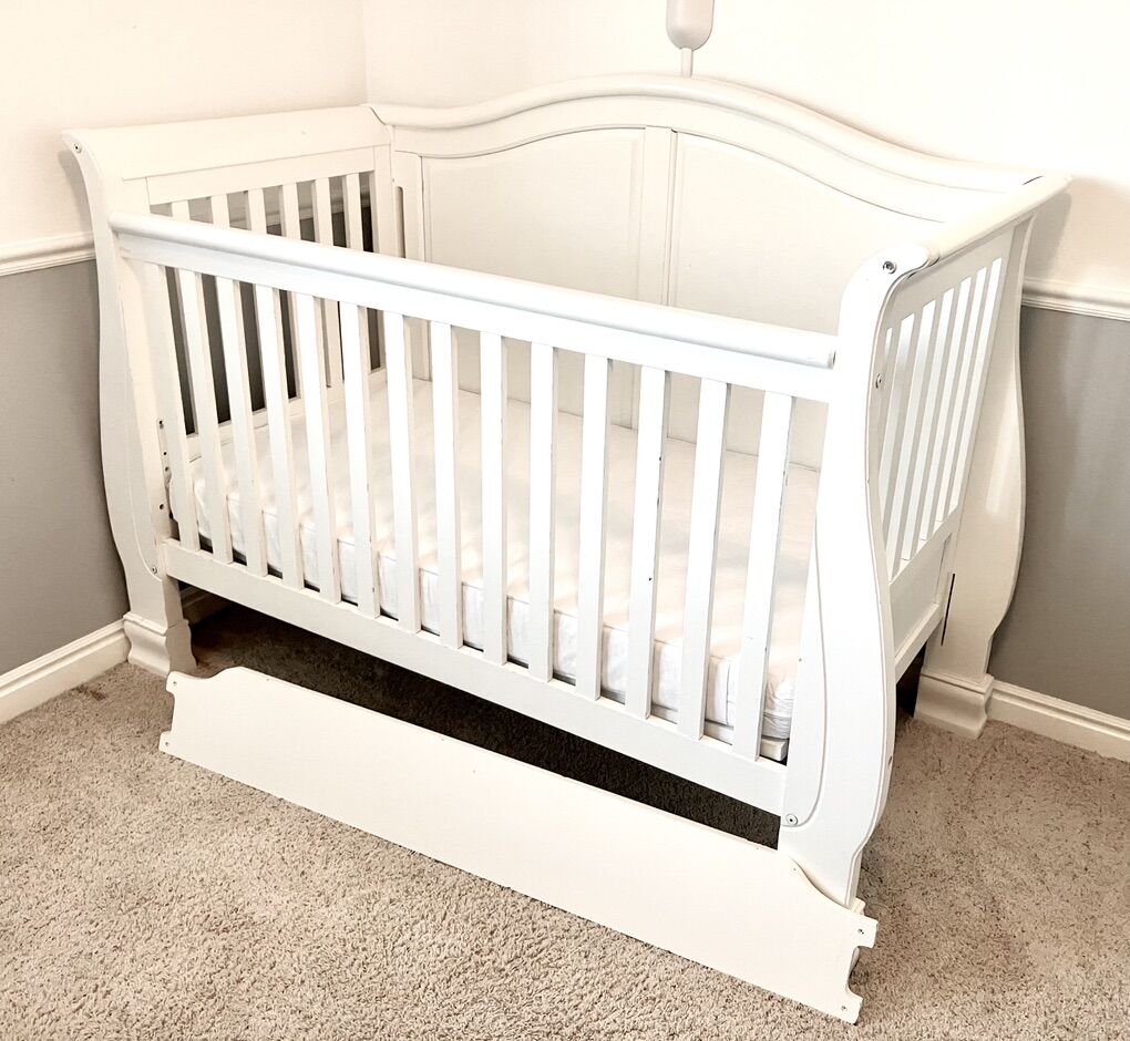 Beautiful solid wood sleigh style white crib. Excellent condition. Solid wood construction. It includes the mattress. No rips tears or stains. All hardware is included for assembly. All parts available to convert into toddler bed.