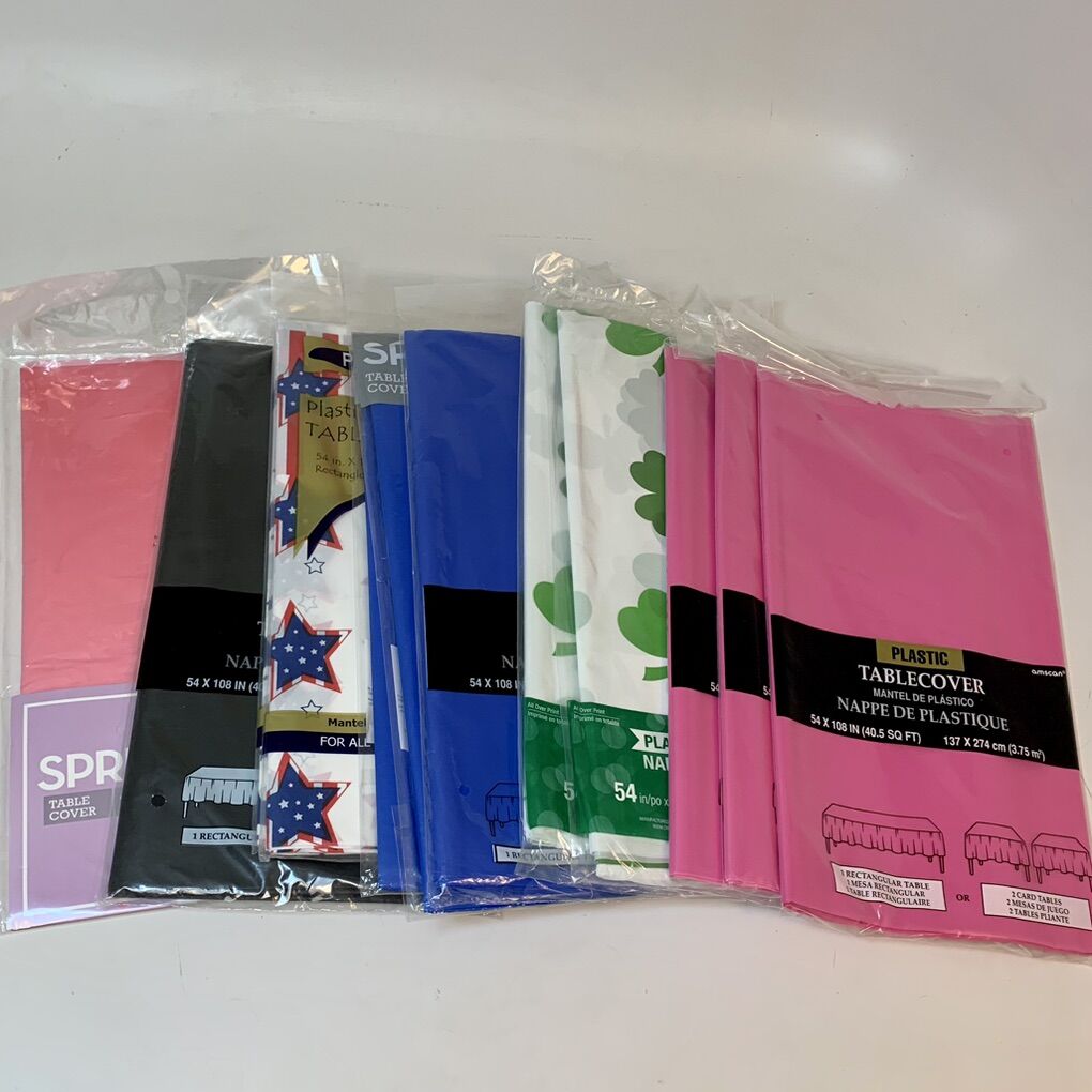 VenmoSizes are all about 54 inch by 102 inch so each one fits a long rectangle table or two square tables. There are 3 Bright Blue, 3 Hot Pink, 2 white with Shamrocks, 2 Stars and Stripes, 1 black, 1 pink. All are New Unopened packages $2 each or all 12 table covers for $20 (1.66 ea.) Please get more than one to make it worth our while Message me if you’re interested.