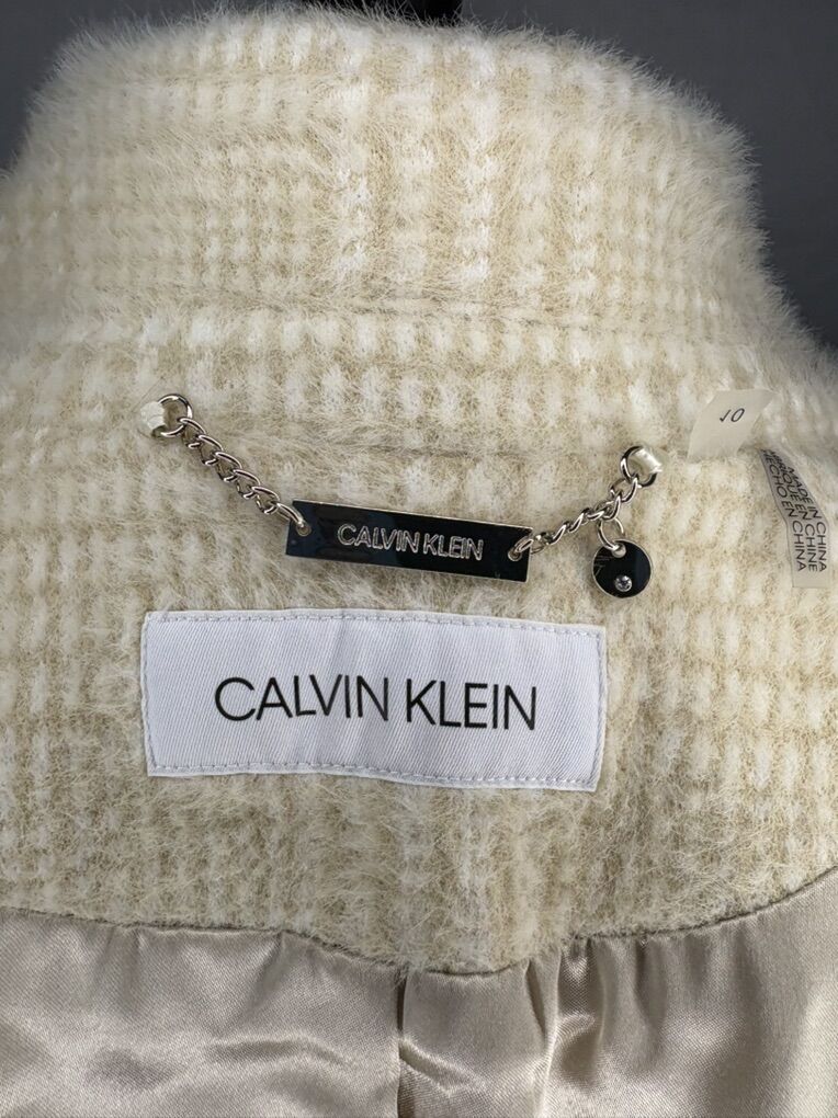 VenmoElegant Calvin Klein long coat in a soft cream/ivory plaid. Features a tailored silhouette with a notched lapel, two-button front closure, flap pockets, and a smooth satin lining. Finished with a signature Calvin Klein chain detail at the interior neck. A timeless, versatile coat perfect for work or dressy occasions.