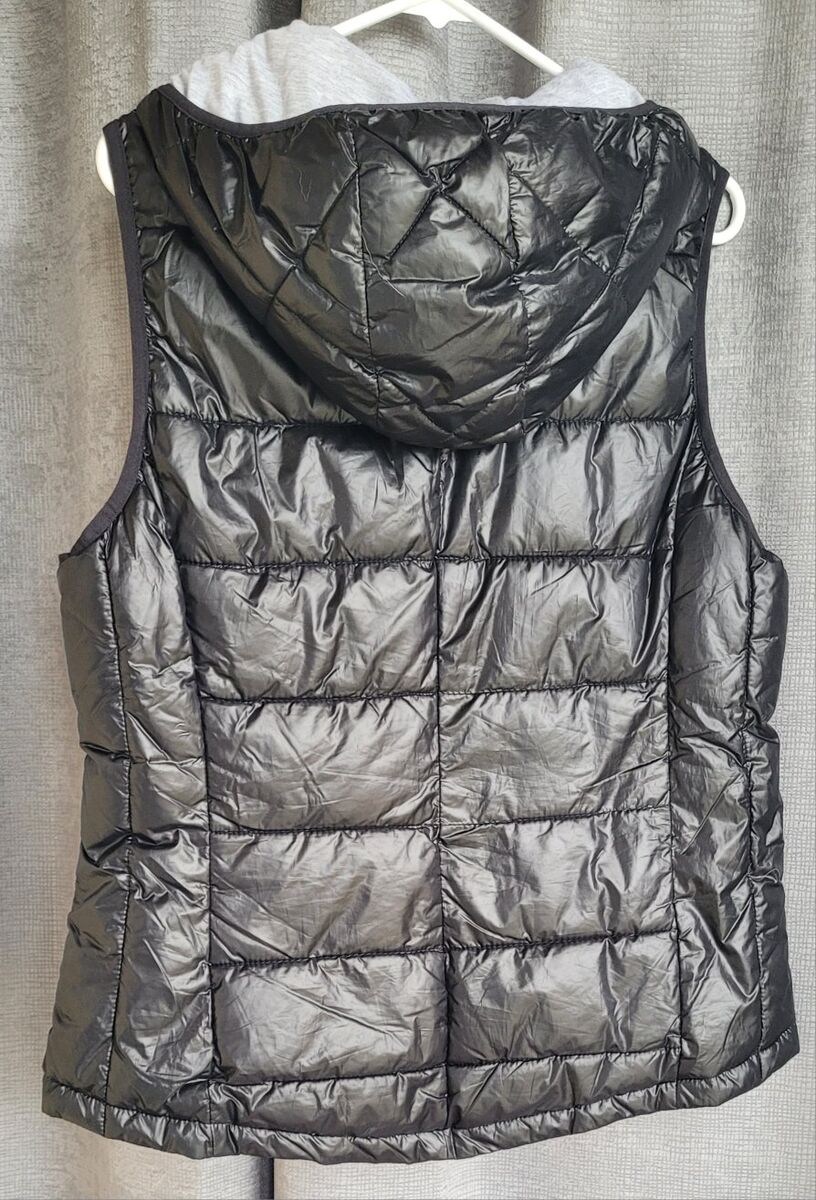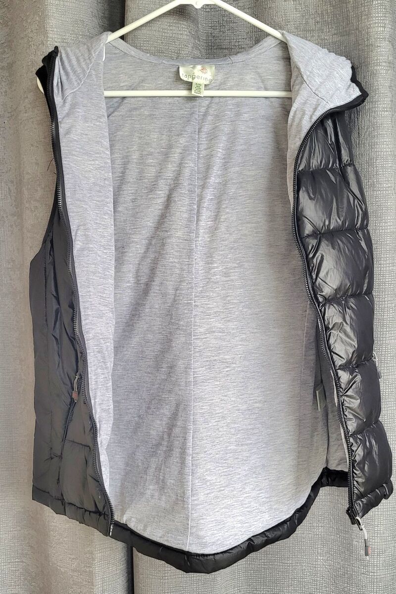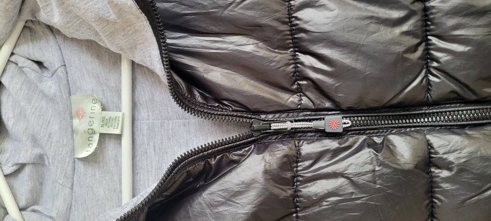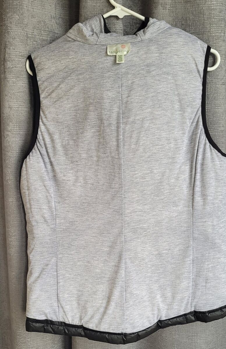 Tangerine Black Puffer Vest Jacket Hooded Womens Sz XL Super soft quilted full zip puffer vest by Tangerine. Two zippered pockets. Attached hood. Inside feels like a soft t-shirt. This vest is in very good pre-owned condition. No holes, tears, snags, stains or odors.