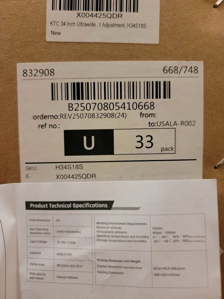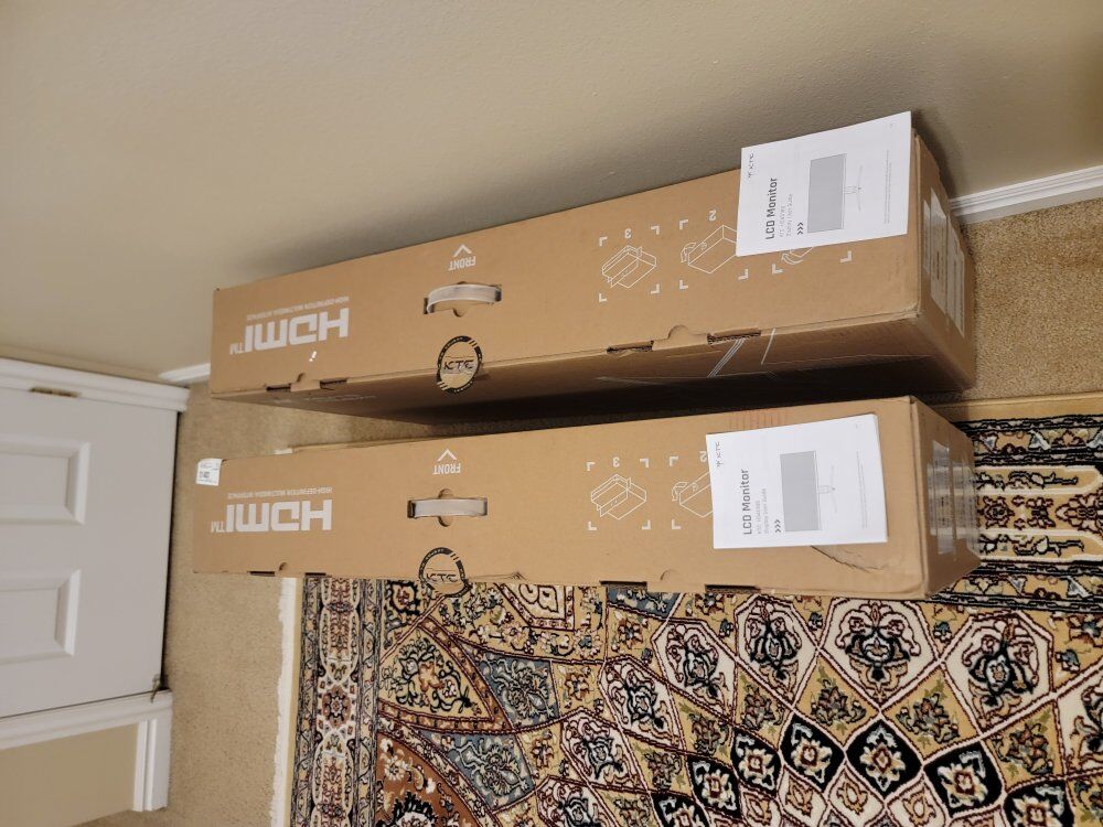 Two matching 34" KTC monitors. Brand New in boxes. Ultra wide curved gaming monitor. UWQHD 3440x1440, 165hz, HDR10. Model # H34S18S. 2 DisplayPort, 2 HDMI. Adjustable in every way. Picture in Picture. Picture by Picture. Can be connected and display feed from two separate sources simultaneously. High contrast, great for gaming. $279 on Amazon before tax.