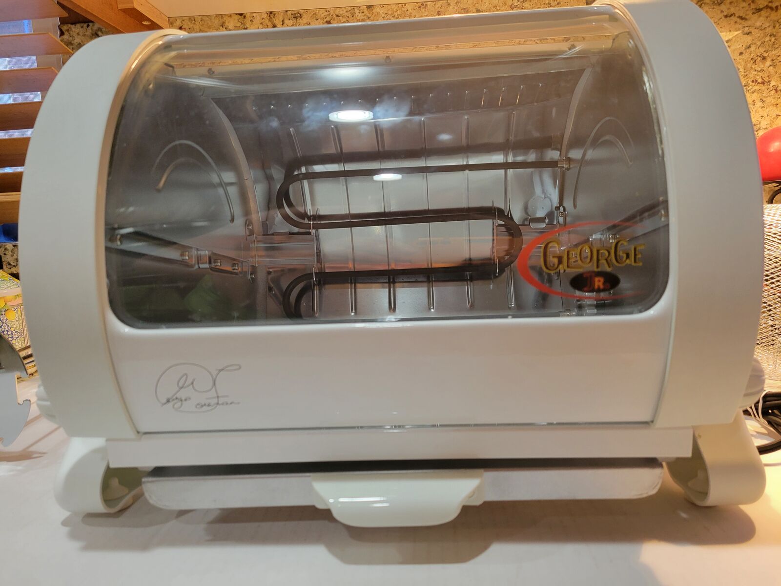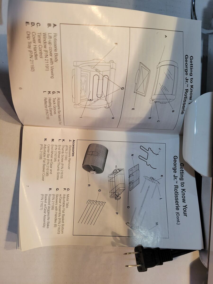 George Foreman Jr. Rotisserie (primarily model GR82B) is a compact, horizontal rotisserie oven designed for healthy, low-fat roasting of meats, poultry, and vegetables. Though it is currently a discontinued legacy product, it remains a popular item on secondary markets like eBay and Etsy for its durability and specific cooking features.
