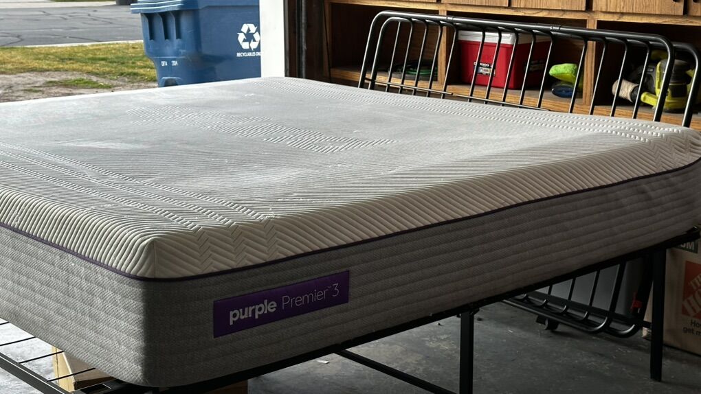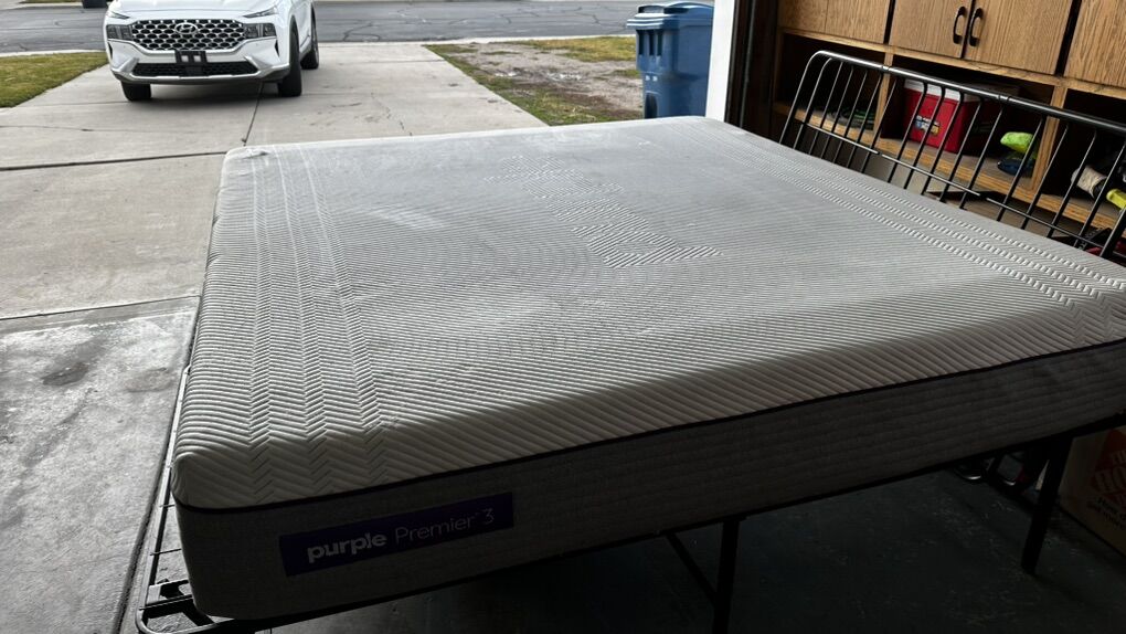 King size Purple Mattress with light, normal wear from use. Clean and well cared bed used for by other elderly relatives. Comfortable and supportive. Comes with all metal platform bed frame.