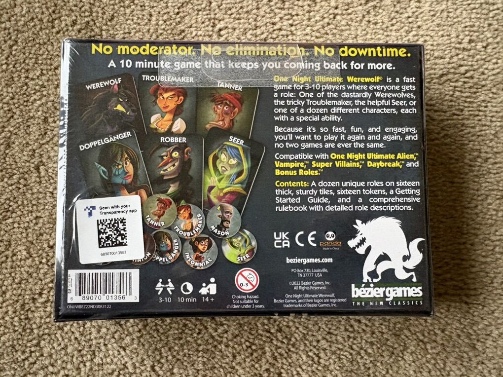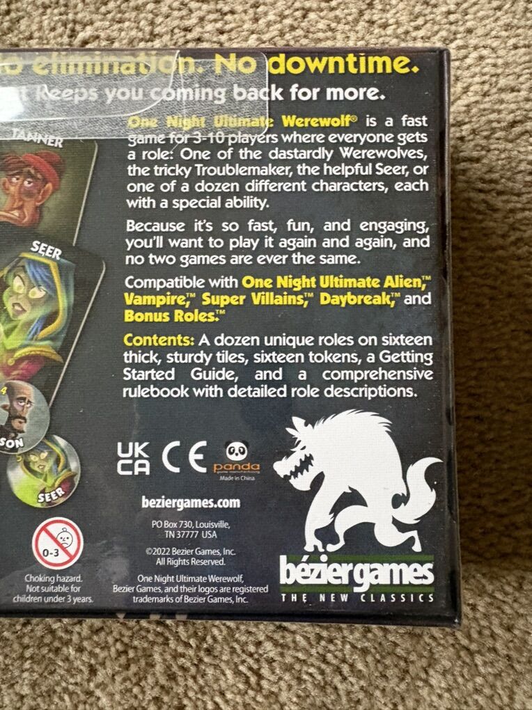 NEW (sealed in plastic) One Night Ultimate Werewolf Game. Bezier Games, 2022. 3-10 players, ages 14+. New, unopened condition. Text only. Cash or Venmo.