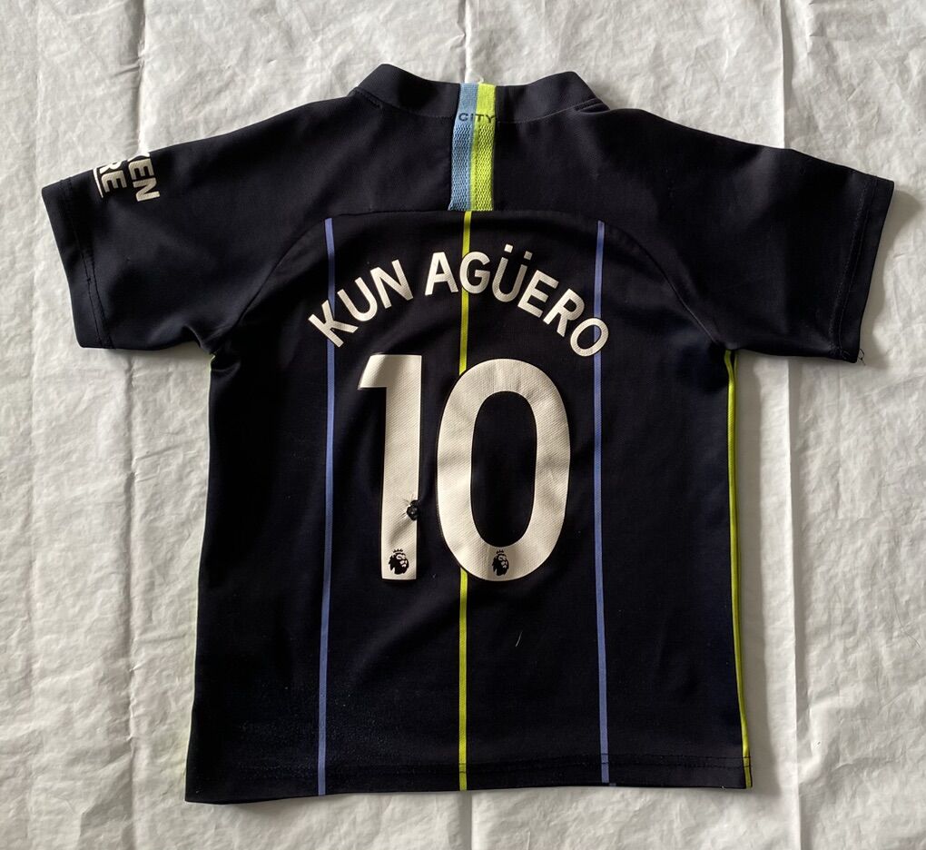 ApplePayThe Nike Manchester City 2018/19 Away Pinstripes Jersey Youth 22 Kun Aguero #10 is a officially licensed soccer jersey featuring the popular player Sergio Aguero. This black jersey is designed for unisex children and showcases the Manchester City team logo. Made by Nike, this jersey is the perfect apparel for young fans looking to cheer on their favorite team and player in style.