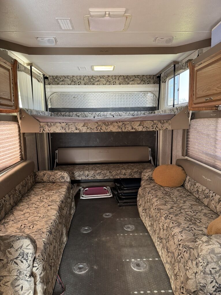 2007 weekend warrior, it’s a great trailer has 150 fresh water, 50 grey, 50 black, 10 gallon water heater. Fridge, heater and A/C all work. Has a onnan 5500 generator onboard with 460 hours. Has a 10 gallon tank for fuel for toys. Can sleep up to 8 people. 32ft long, 13000 pounds. Triple axle. It’s a great trailer. Fits my 2019 rzr turbo S easily. Battery is 3 years old. Has 3 propane tanks.
