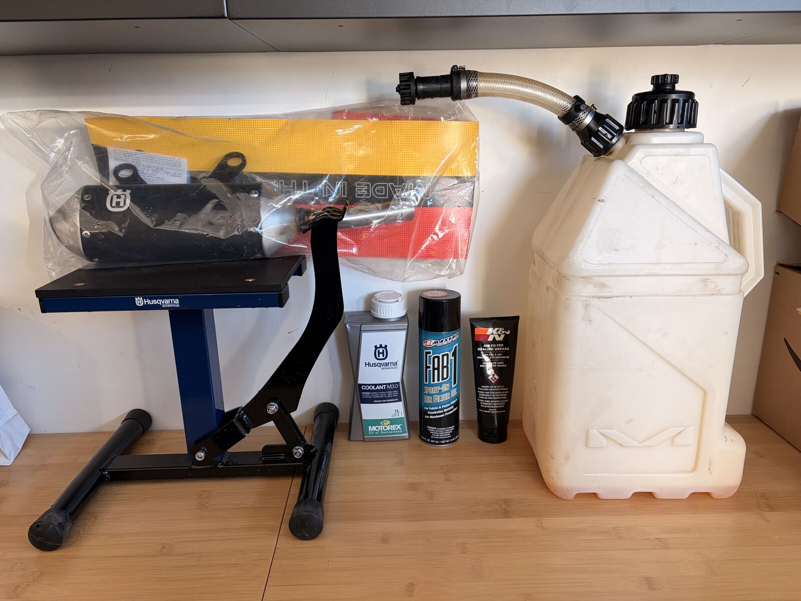 I'm also throwing in some of other stuff too: M3 4g gas can Husqvarna lift stand Husqvarna OEM Silencer Coolant Filter Oil Filter Grease