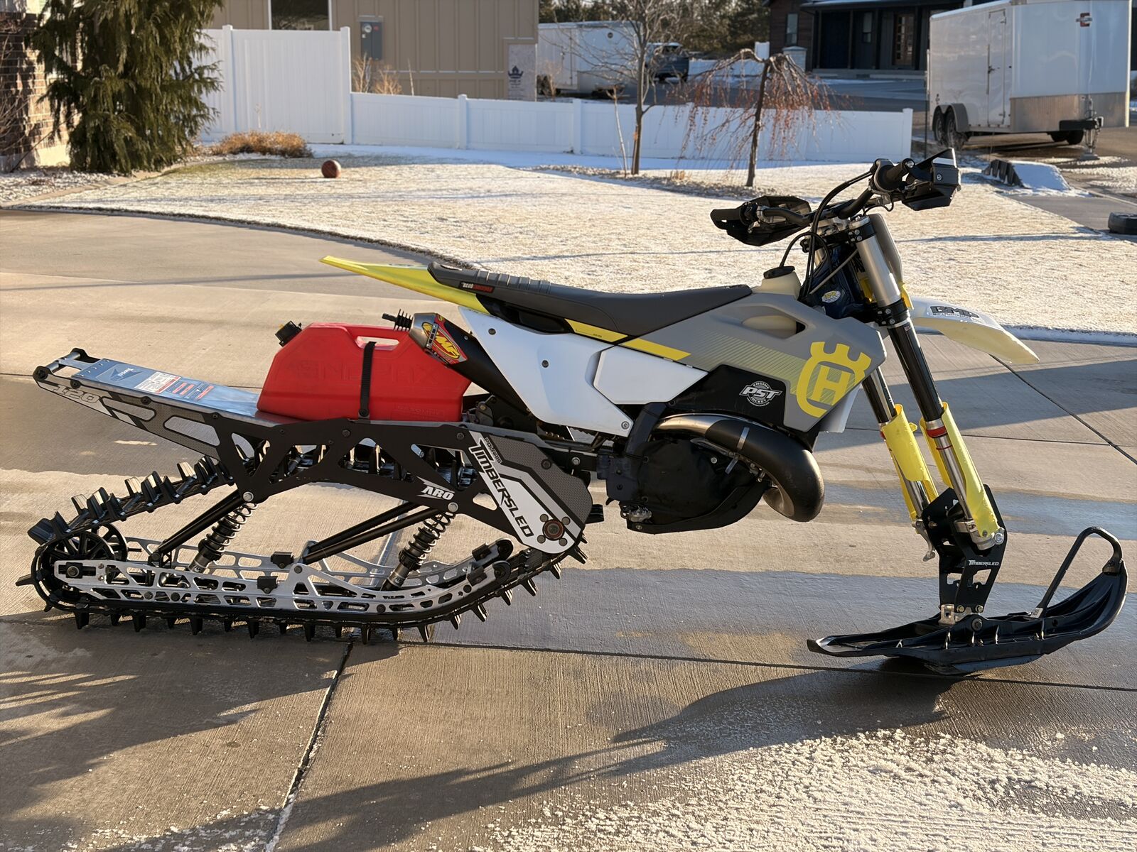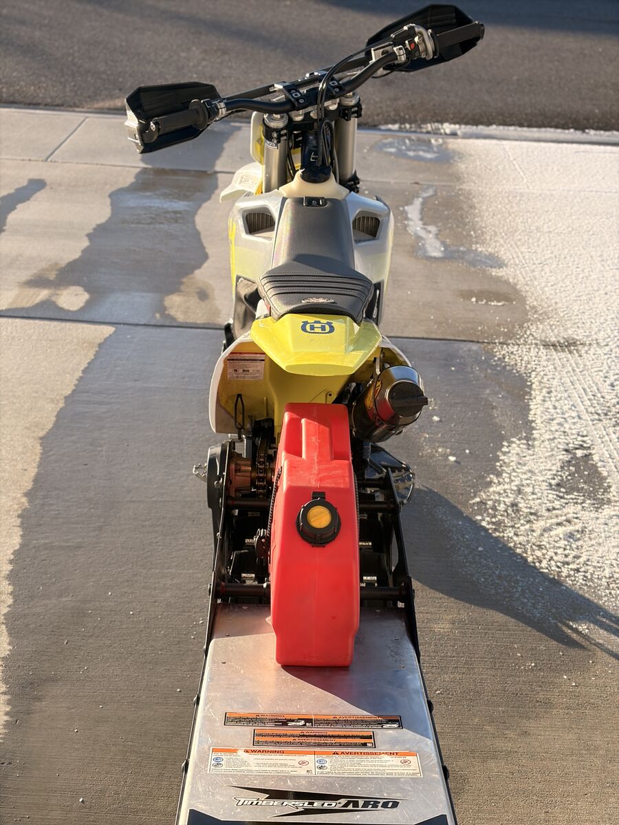 The Timbersled is a 2019 ARO 120 which is the perfect size. The sled and bike are nearly brand new as you can see. Lots of add ons to the snowbike: C3 Intake installed C3 Forcefield Handguards PST Engine Jacket with cold weather panel Snopax 2.5g gas can Seat Concepts wide seat Carbon Fiber Pipe Guard Carbon Fiber Upper Fork Guards FMF Turbinecore Pipe