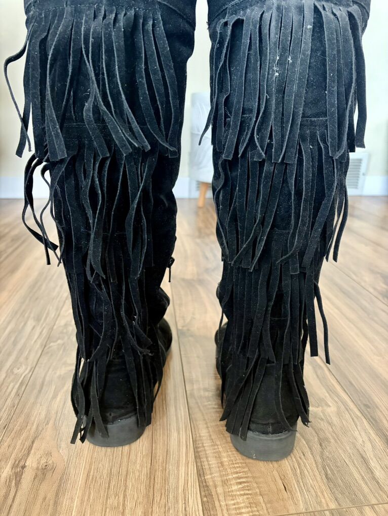 VenmoSelling these women’s knee-high black fringe boots. The size on them says Large 8/9. They are still in good condition. Asking $10.