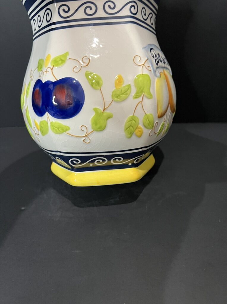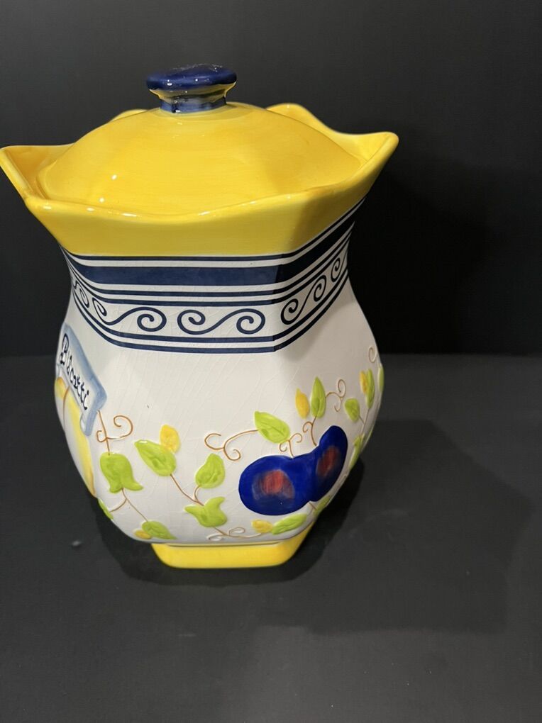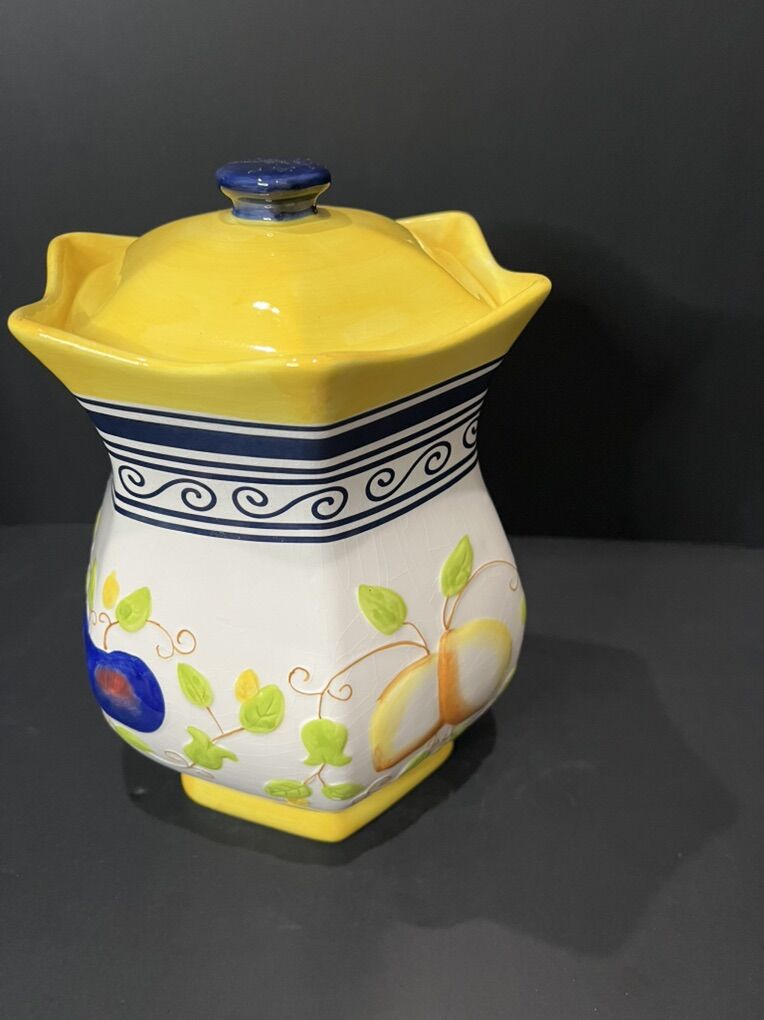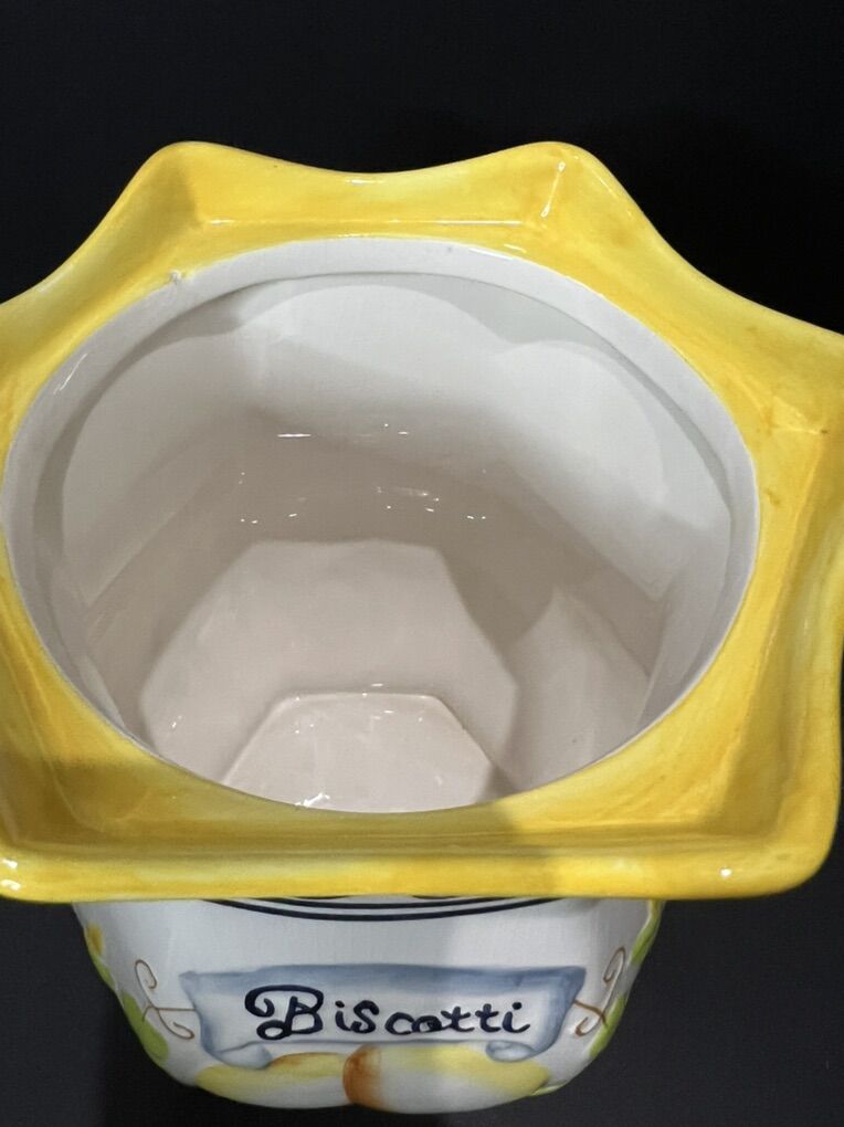 Vintage Nonni's ceramic hand-painted biscotti cookie jar. It features a Tuscan-inspired design with yellow, blue, and green colors. The jar is decorated with painted lemons, plums, and leaf motifs. It has a hexagonal shape and a lid with a seal.