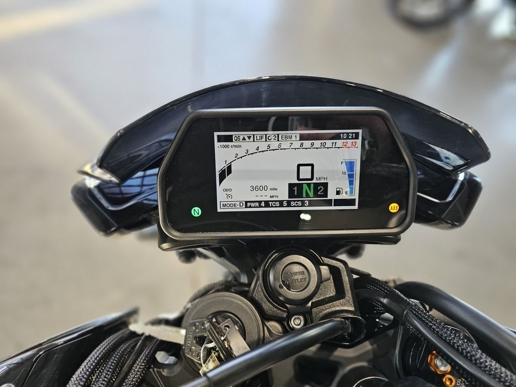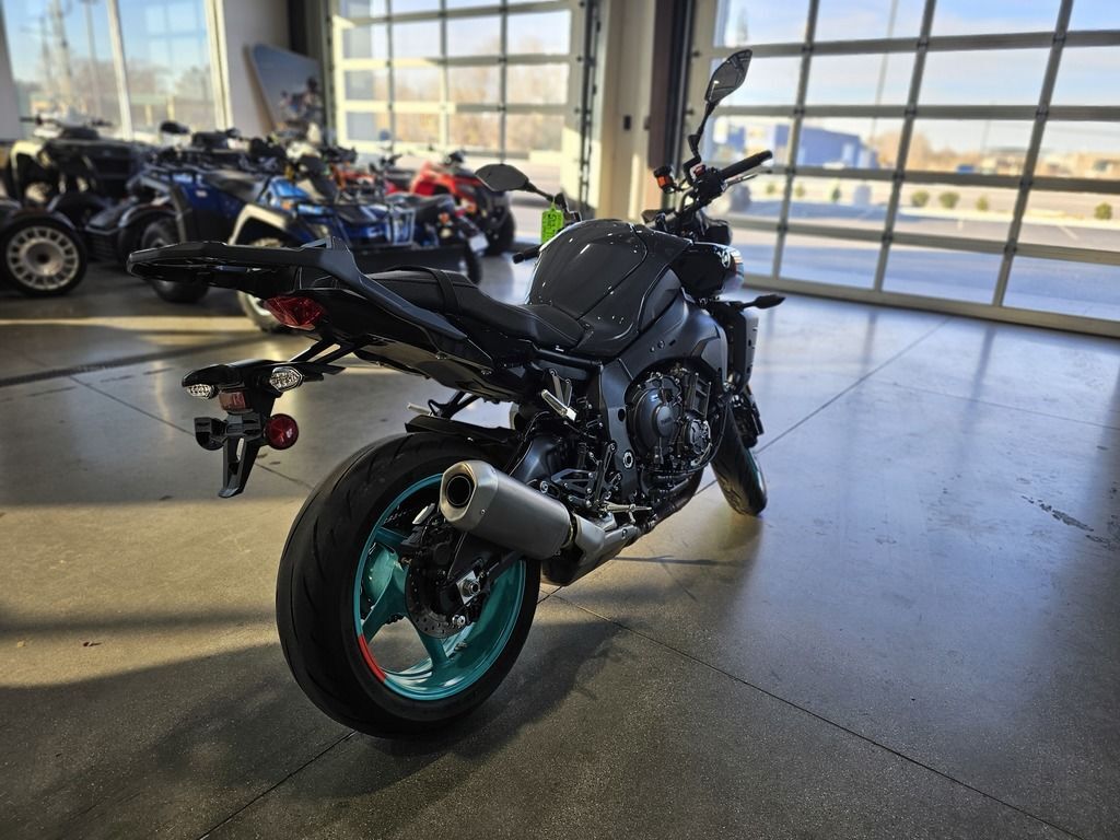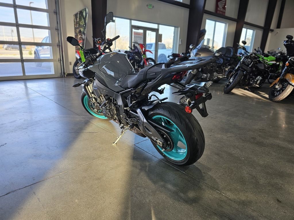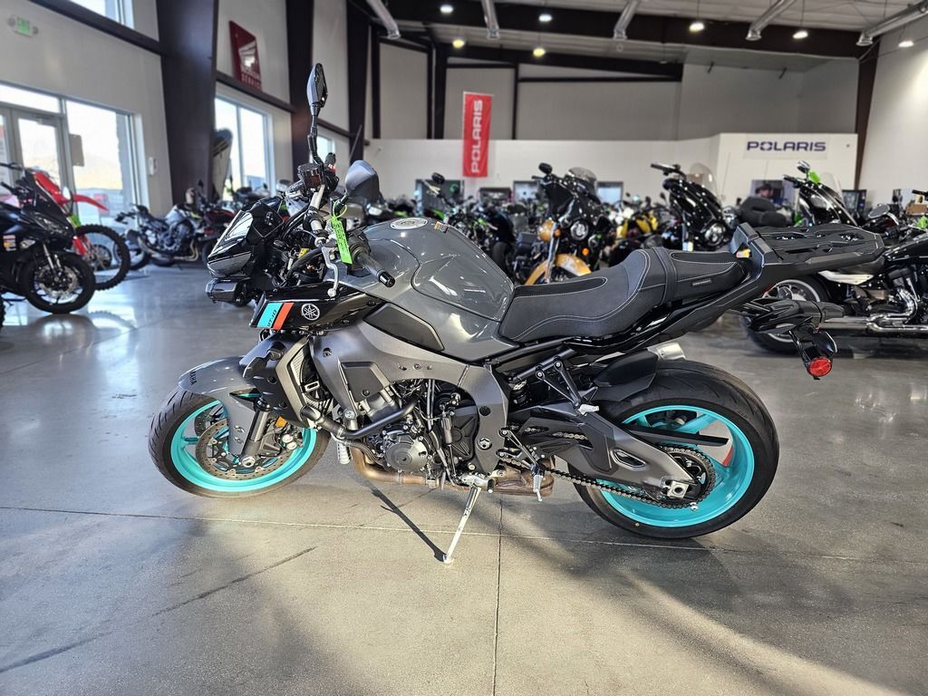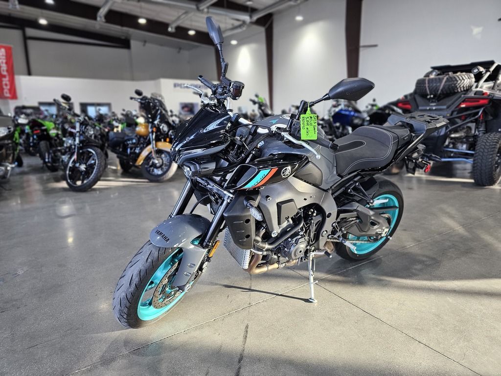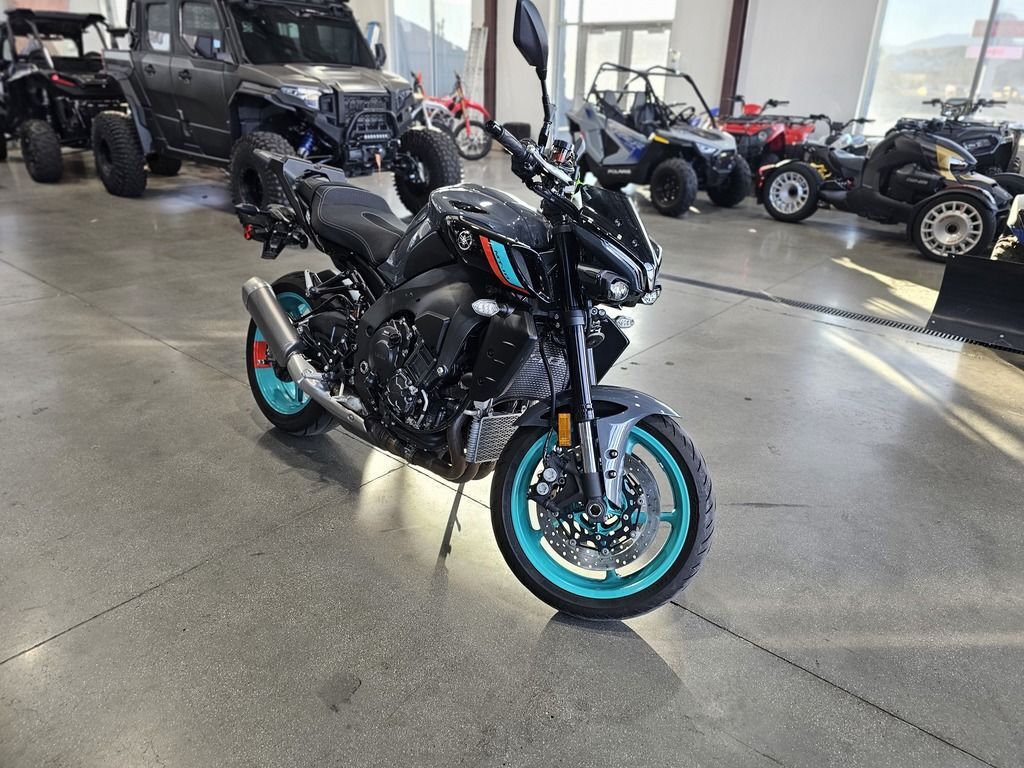 2023 Yamaha MT-10 THE DARKEST ENERGY The pinnacle of MT crossplane torque, distinct styling and agile handling lets you dominate the Darkness. Features may include: TOP FEATURES Compact, Aggressive MT Styling A stripped-down look is achieved by removing unnecessary bodywork elements and refocusing attention on the pure mechanical beauty of the muscular engine and compact frame. Twin-eye mono-focus LED headlights and LED position lights situated above the headlights combine with a compact nose assembly to minimize overhang and lend a refined, dominant style. Enlarged, functional intake ducts mounted on either side of the fuel tank cover increase efficiency while further enhancing the bike’s aggressiveness. Six-Axis IMU with Rider Aids The MT-10 takes a significant step forward in technological advancement with the addition of Yamaha’s state-of-the-art six-axis Inertial Measurement Unit. Originally developed for the YZF-R1, the IMU on the MT-10 has now evolved into a smaller and lighter unit, featuring two sensors that measure three-axis angular velocity and three-axis acceleration, enabling a suite of rider aids including lean sensitive traction control, a Slide Control System (SCS), a front wheel Lift Control System (LIF), Engine Brake Management (EBM) and a Brake Control (BC) System with lean sensitive ABS. ENGINE R1-Derived Crossplane Crankshaft Engine The potent 998cc inline four-cylinder engine features the same Crossplane Crankshaft technology developed in Yamaha’s renowned YZF-R1 superbike. The crossplane design nearly eliminates inertial engine torque to provide a direct connection between the throttle and rear wheel for maximum traction and linear torque feeling. Tuned specifically for the needs of the high-performance street rider, the MT- 10 engine develops awesome low- and mid-rpm torque with arm-stretching top-end power. CHASSIS/SUSPENSION Deltabox Aluminum Frame The MT-10 uses an aluminum Deltabox frame derived from the YZF-R1 superbike to create a lightweight and responsive chassis that is built for agility with its ultra-compact 55.3-inch wheelbase. The frame uses a strength-rigidity balance that was developed specifically for the MT-10 and uses the engine as a stressed member of the frame for optimal cornering performance. Fully Adjustable KYB® Fork The MT-10 features an inverted 43mm KYB® front fork which offers full adjustability and 4.7 inches of travel, for excellent front-end feel and road holding along with an adjustment range ready for a variety of street or track conditions. ADDITIONAL FEATURES Rider-focused Ergonomics Ergonomics on the MT-10 focus on greater comfort and control. Protruding areas around the fuel tank are reduced offering more freedom of movement and better feel when the rider grips the tank with their knees under hard braking or cornering. The ‘rider triangle’—the bar/footrest/seat relationship—is optimized for a feeling of sitting more within the bike. Additionally, seat firmness is enhance comfort. ELECTRONICS Six-Axis IMU with Rider Aids The MT-10 takes a significant step forward in technological advancement with the addition of Yamaha’s state-of-the-art six-axis Inertial Measurement Unit. Originally developed for the YZF-R1, the IMU on the MT-10 has now evolved into a smaller and lighter unit, featuring two sensors that measure three-axis angular velocity and three-axis acceleration, enabling a suite of rider aids including lean sensitive traction control, a Slide Control System (SCS), a front wheel Lift Control System (LIF), Engine Brake Management (EBM) and a Brake Control (BC) System with lean sensitive ABS.