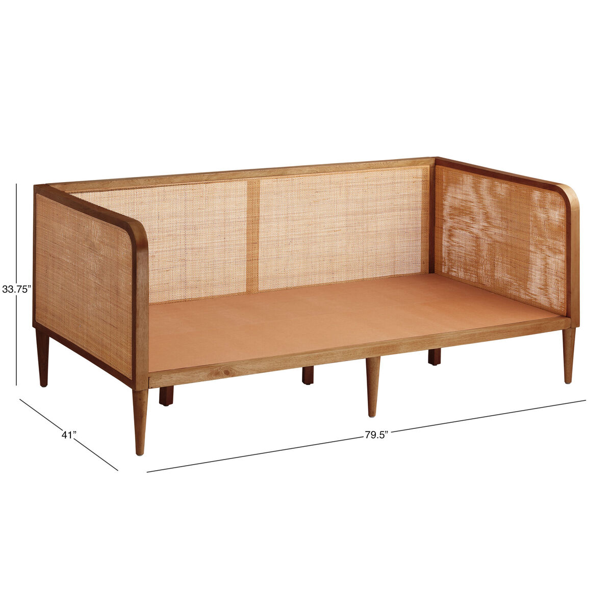 Brand New World Market Kira Rattan Daybed A clean-lined wooden frame adorned with webbed panels of rattan cane, the Kira daybed frame shines natural warmth into the studio, office or spare room: its organic look styles with a variety of wood finishes, natural fiber furnishings and decor from boho to modern. When not accommodating a guest, it's a perfectly cozy occasional seat that fits compactly into your living space. Overall Dimensions: 79.5W x 41D x 33.75H