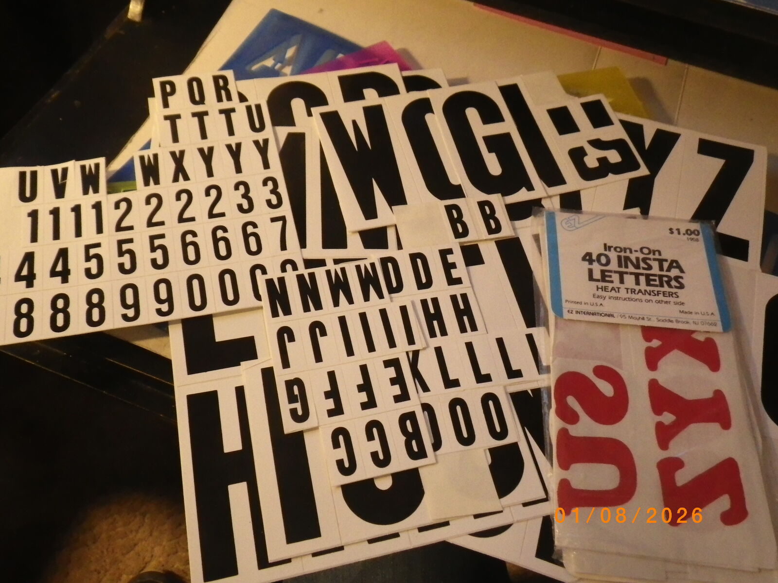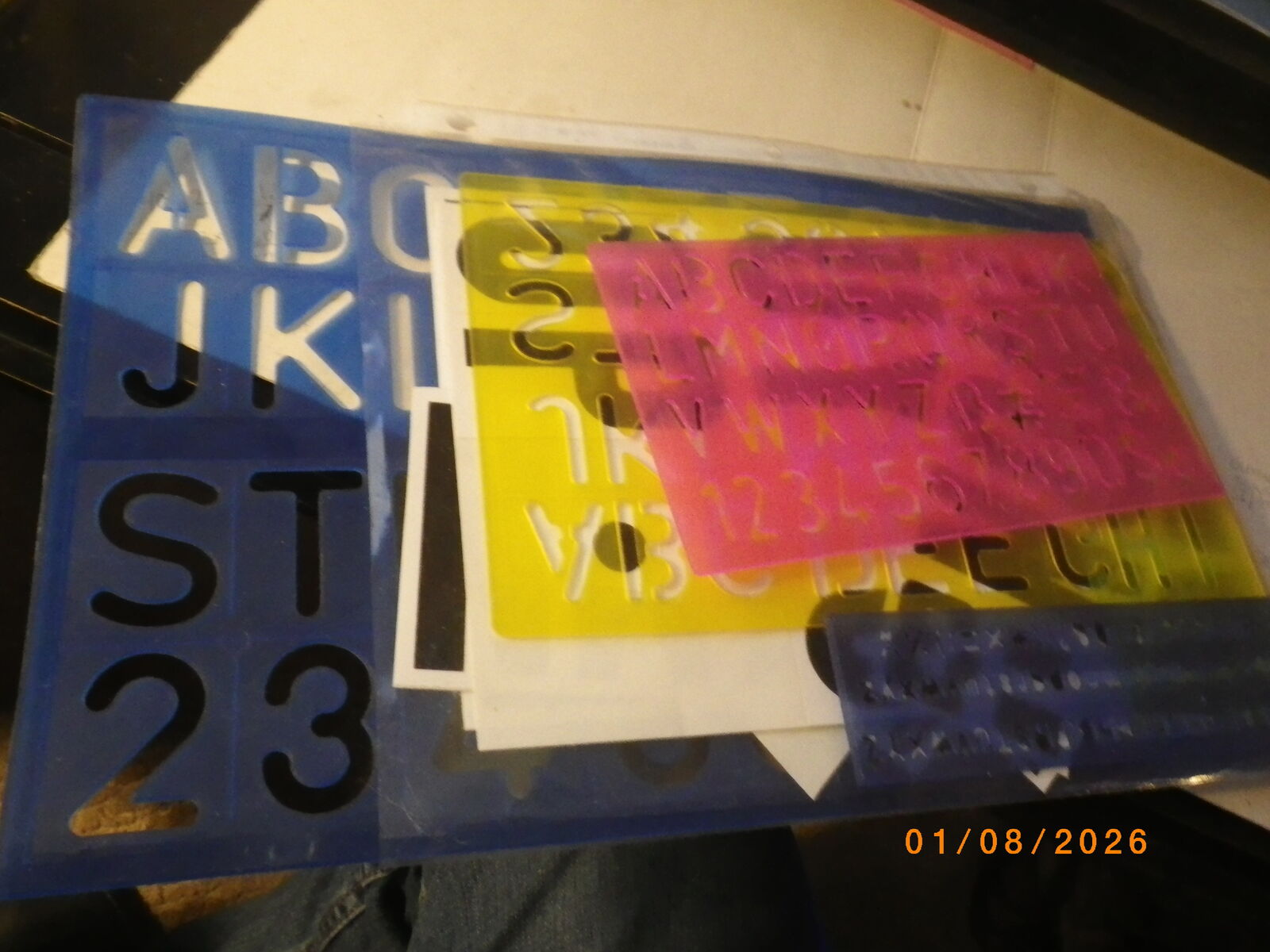 5 plastic stencils of various sizes and some stick on letters & numbers, including new pack of iron-on letters.