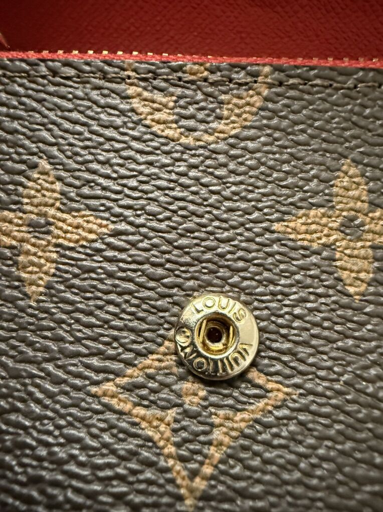Monogram coated canvas Grained cowhide-leather trim Grained cowhide-leather lining Gold-color hardware Press-stud closure Zipped coin pocket Bill pocket 2 flat pockets 6 card slots