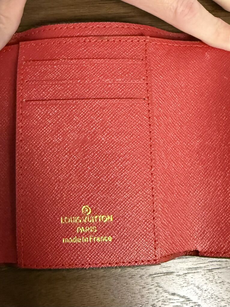 Compact wallet in monogram canvas. It opens to reveal practical features, including card slots and pockets for bills and coins.