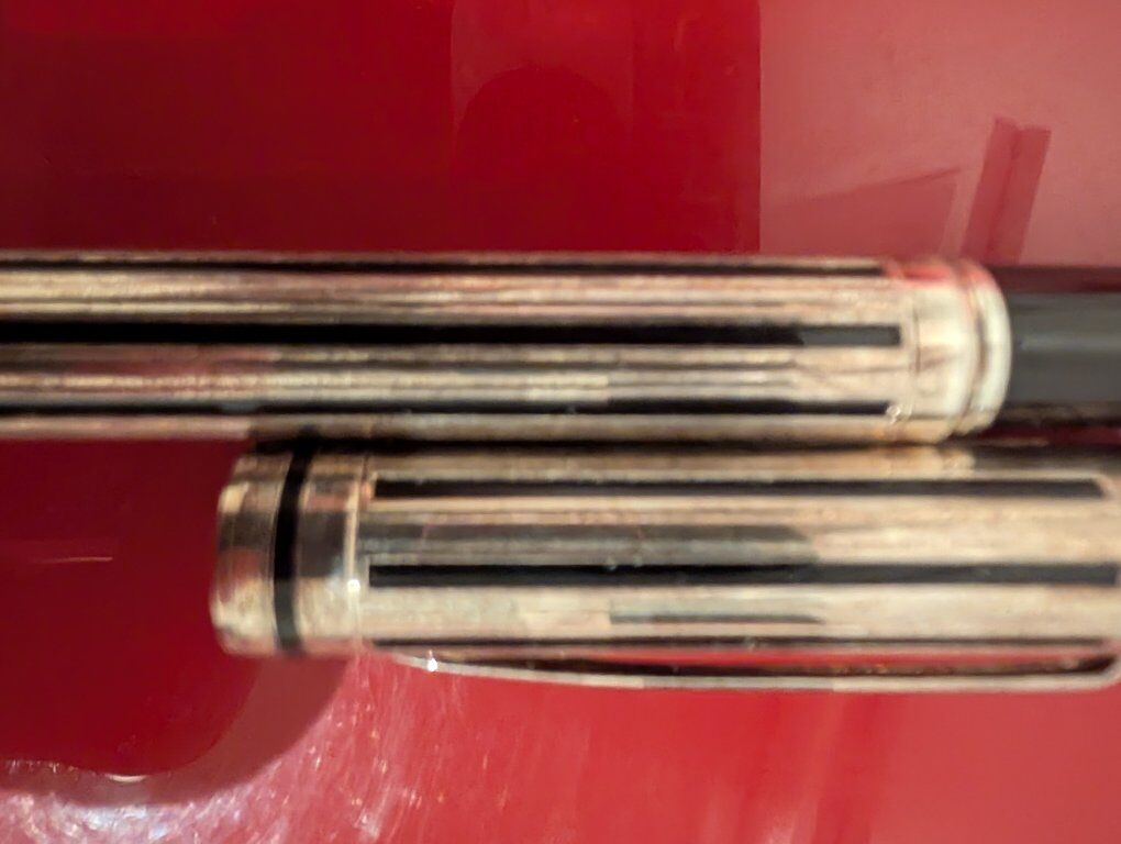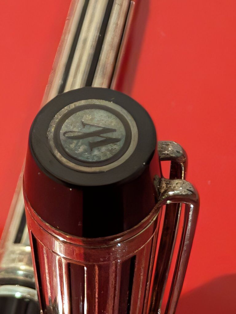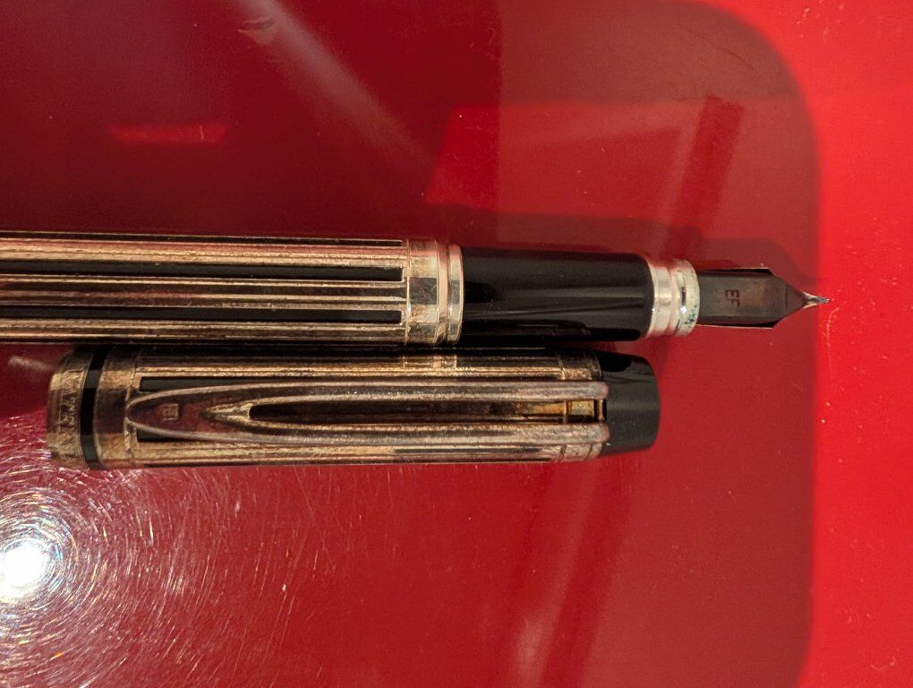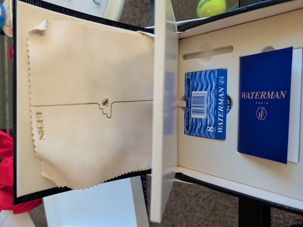 GooglePayCondition: Pre-owned – Excellent Brand: Waterman Model: Leman 200 Edition: Night & Day – La Collection de Waterman Nib: 18K Gold – Medium Finish: Silver plated Art Deco overlay Made in: France Includes: Original box, polishing cloth, ink cartridges, paperwork Description: Offered for sale is a Waterman Leman 200 “Night & Day” fountain pen from La Collection de Waterman, a first-edition Art Deco inspired release. This model features Waterman’s striking silver-plated overlay over a dark lacquered body, echoing Waterman’s 1920s luxury pens. The pen is fitted with an 18K gold medium nib and writes smoothly and consistently. This example is offered complete with its original presentation box, polishing cloth, Waterman paperwork, and ink cartridges, making it a highly desirable collector set. The pen is in excellent pre-owned condition with no dents, cracks, or plating loss. The overlay is crisp and clean. The box shows light storage wear. This is a rare opportunity to acquire one of Waterman’s most elegant modern limited designs.
