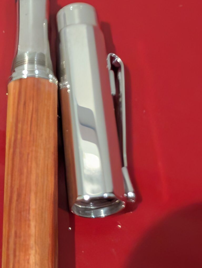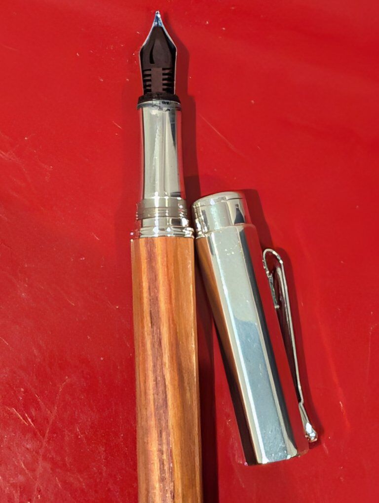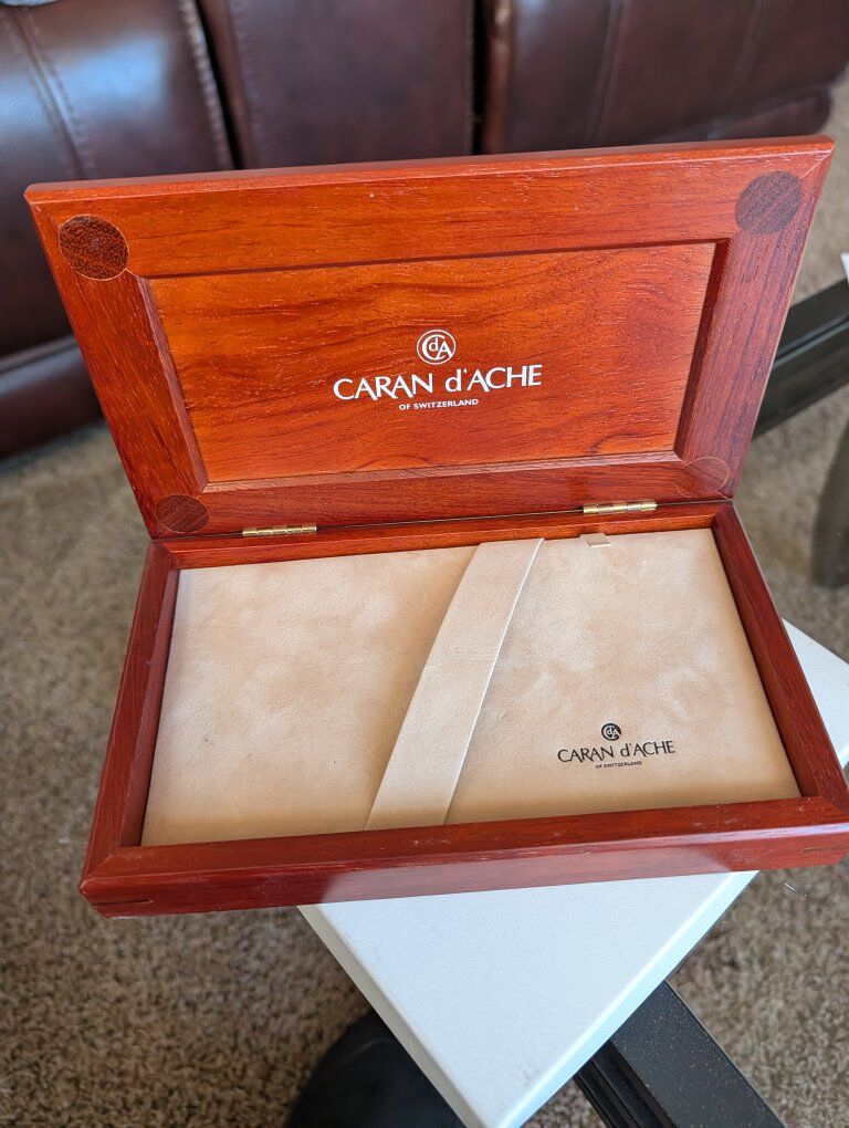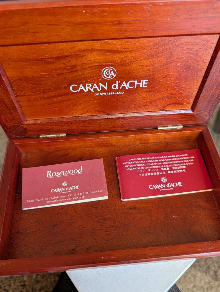 GooglePayCondition: Pre-owned – Excellent Brand: Caran d’Ache Model: Varius Metwood Material: Genuine Rosewood (Palisander) & Rhodium-Plated Metal Nib: 18K Gold (750) Filling System: Cartridge / Converter Made in: Switzerland Includes: Original Caran d’Ache wooden presentation box, rosewood & rhodium cards, warranty booklet Description: Offered is a Caran d’Ache Varius Metwood Rosewood Fountain Pen, presented in its original Caran d’Ache hardwood display box with all accompanying documentation. The Varius Metwood series represents Caran d’Ache’s highest-grade writing instruments, combining solid Swiss engineering, precious metal, and natural exotic wood. This example features a beautifully figured rosewood (palisander) barrel paired with a rhodium-plated hexagonal cap and trim. The pen is fitted with a Swiss-hallmarked 18K (750) gold nib, engraved with the Caran d’Ache logo. The nib is smooth and responsive, ideal for both everyday writing and collectors. This set includes: The Varius Metwood fountain pen Original Caran d’Ache wood presentation case Rosewood material card Rhodium care card Caran d’Ache warranty and information booklet The pen and box are in excellent pre-owned condition, with only light handling marks and no cracks, dents, or damage. This is a rare opportunity to acquire a complete Varius Metwood set, no longer produced and highly sought after by collectors.
