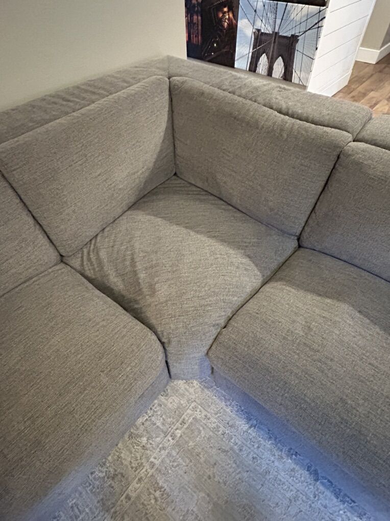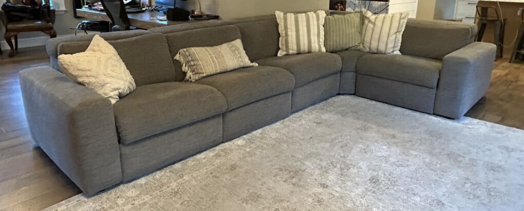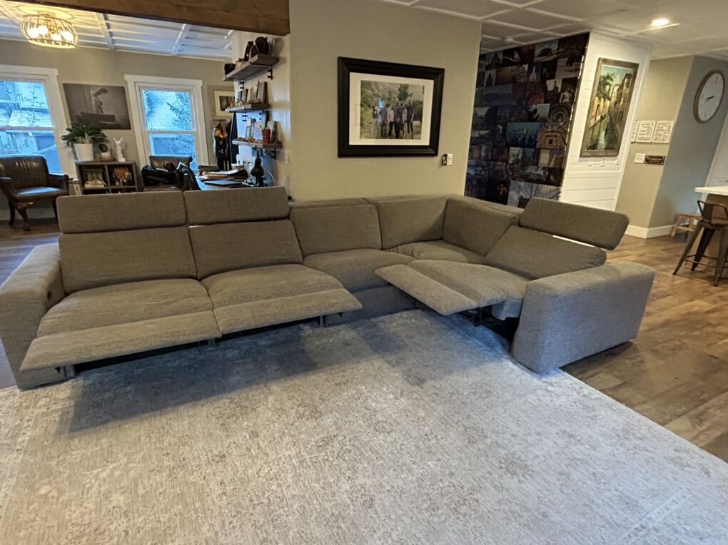 ApplePayGray, fabric, electronic reclining modular sectional with electronic headrests. Originally purchased from Downeast Home. Used and in very good condition. No fabric damage, rips or tears. You can move pieces to customize your configuration. 3 pieces with electronic recline/headrests. 2 end pieces have USB plug ins. All pieces link together to keep pieces from shifting around. Backsides are in perfect condition and look great when exposed. Also works perfectly against a wall. Corner piece has a dip in the foam seating due to that being a comfy place to lounge, could prob be fixed fairly easily if you choose, but still works great as is. Smoke free home. We do have a non-shedding, hypoallergenic dog. Upholstery has been cleaned (no longer used/moved out of room) and is ready for your immediate use. Photos taken prior to cleaning. See photos for measurements. Venmo, Apple Pay, PayPal or cash only.