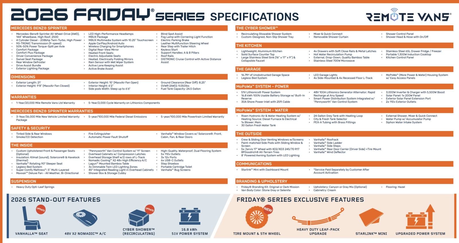 The Friday is a top of the line adventure van that blends premium comfort with serious off-grid capability. Built on a Mercedes-Benz Sprinter AWD platform, Friday is designed for travel, work, and extended stays—wherever the road leads.