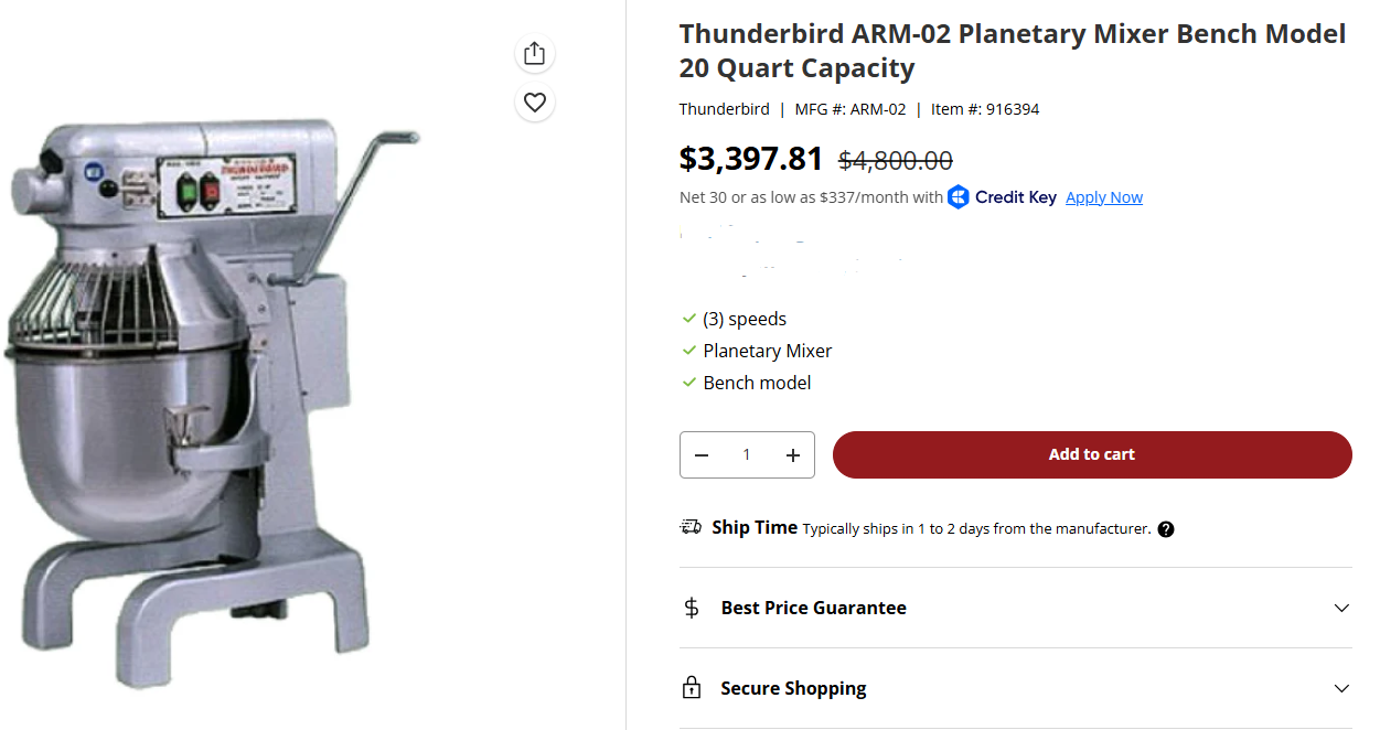 VenmoNEW IN BOX Thunderbird ARM-02 Planetary Mixer (5 AVAILABLE) 20-quart capacity 1-15minute timer for continuous or timed operation Powerful 3/4 HP motor 115v/60/1, 14amps (220v/60/1 and 220v/50/1 available at additional cost) 3-Speed gear box Transmission: Wide-faced, hardened alloy steel, helical gears fully sealed in transmission lubricant with heavy-duty ball bearings and clutch combine for highly dependable, quiet operation. Motor cooling system. New safety Guard available. NSF approved coating. Baked painting. Moisture resistant switches Motor thermal protector. No-volt Release: Prevents activation of the mixer in the event of power interruption Bowl lift: Manual bowl lift operated and self-locking in to position #12 size taper hub for attachments Cast base construction. Silver metallic finish using epoxy powder coat enamel for easy cleaning Attached 6-foot, flexible, 3-wire cord and plug for grounded receptacle